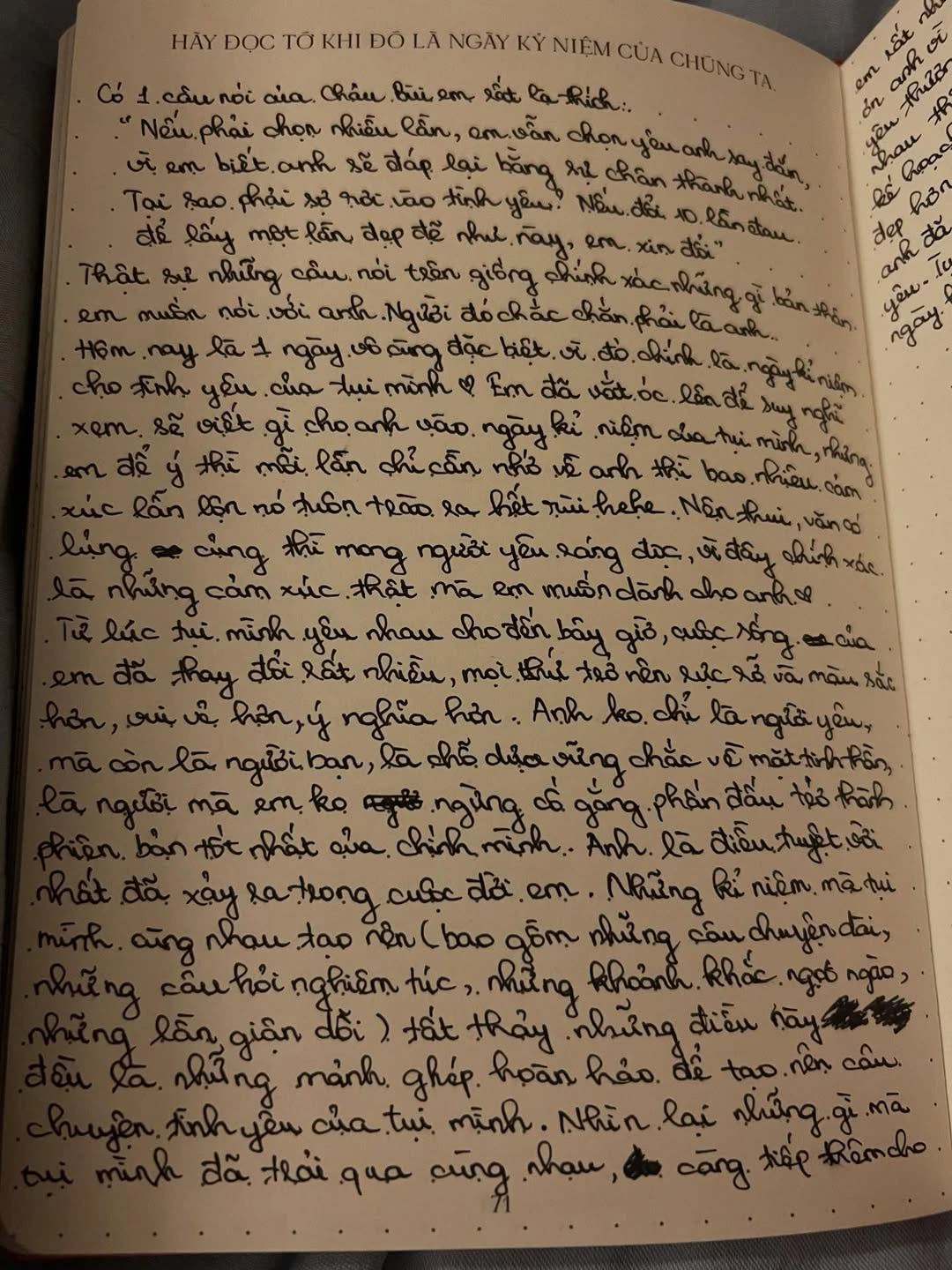 [...] Từ lúc tụi mình yêu nhau cho đến giờ cuộc sống của em đã thay đổi rất nhiều, mọi thứ trong cuộc sống ý nghĩa hơn, vui vẻ hơn, ý nghĩa hơn. Anh không chỉ là người yêu mà còn là người bạn, là chỗ dựa vững chắc mỗi lúc em yếu mềm, là người mà em không ngừng cố gắng phấn đấu trở thành phiên bản tốt nhất của chính mình. Anh là điều tuyệt vời nhất đã xảy ra trong cuộc đời em" .