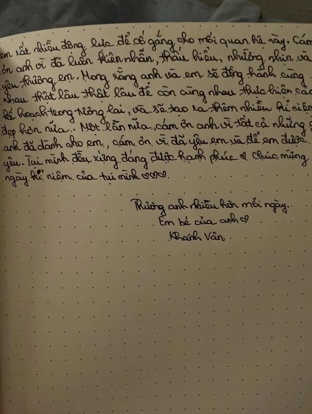 "Mong rằng anh và em sẽ đồng hành cùng nhau thật lâu thật lâu để còn cùng nhau thực hiện các kế hoạch trong tương lai, và... sẽ tạo ra thêm nhiều kỷ niệm đẹp hơn nữa. Một lần nữa, cảm ơn anh vì tất cả những gì anh đã dành cho em, cảm ơn vì đã yêu em và để em được yêu. Tụi mình đều xứng đáng được hạnh phúc. Chúc mừng ngày kỷ niệm của tụi mình anh nhé" , Khánh Vân nhắn gửi đến Bốp.