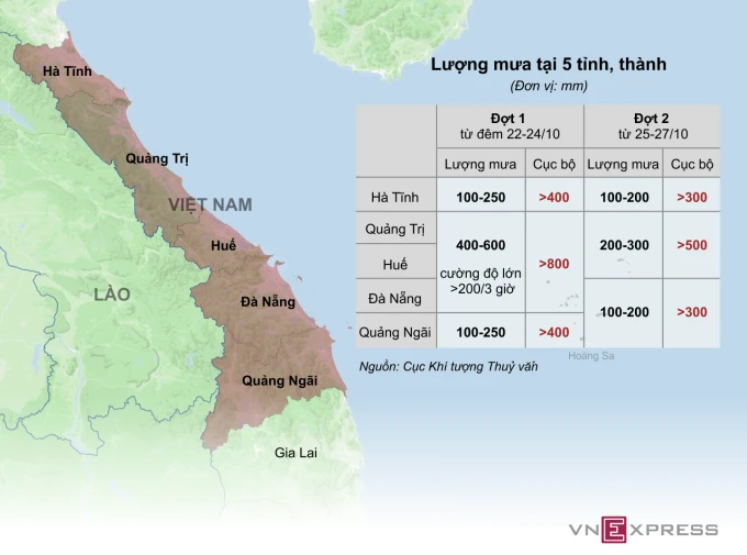 Mưa lớn sẽ chia làm hai đợt. Đợt một từ đêm nay đến ngày 24/10 do ảnh hưởng của hoàn lưu bão, không khí lạnh và gió đông. Quảng Trị – Đà Nẵng dự báo mưa 400-600 mm, cục bộ trên 800 mm, mưa cường độ lớn trên 200 mm trong ba giờ. Khu vực Hà Tĩnh, Quảng Ngãi mưa 100-250 mm, cục bộ trên 400 mm.