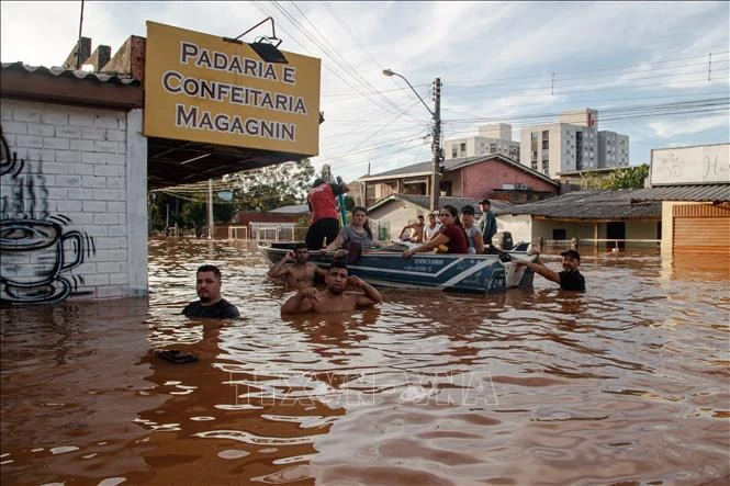 Lực lượng cứu hộ sơ tán người dân khỏi vùng ngập lụt tại Santo Afonso, Novo Hamburgo, Rio Grande do Sul, Brazil. Ảnh tư liệu: THX/TTXVN
