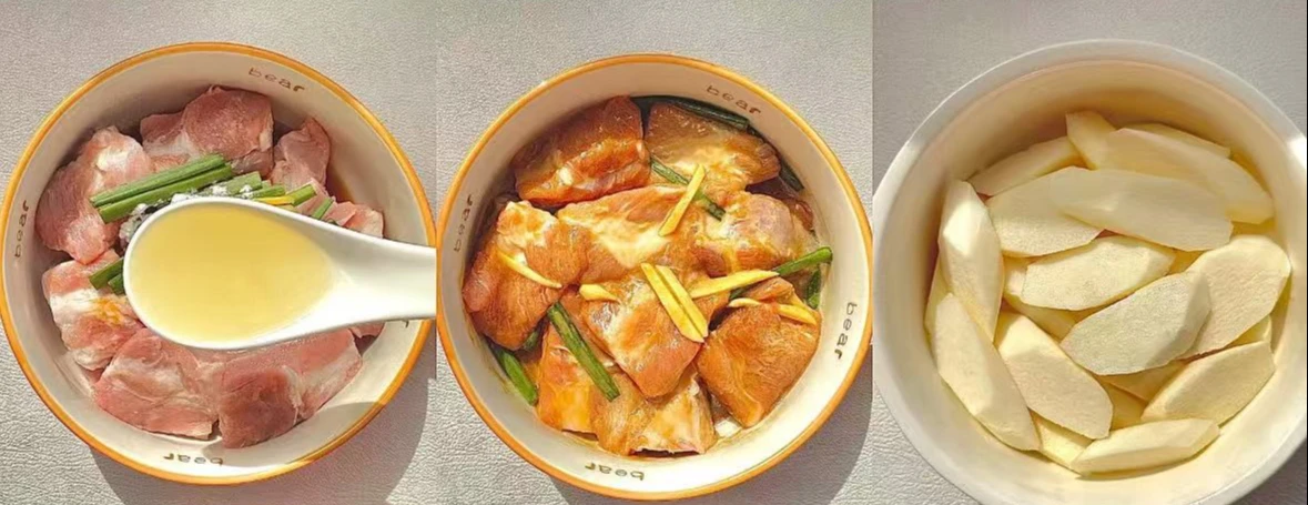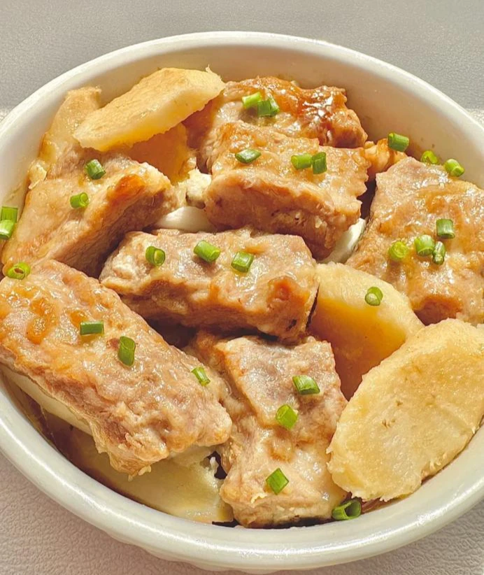 Nguyên liệu: 500g sườn heo, 1 đoạn củ mài, 2 cây hành lá cắt khúc, một nhánh gừng thái sợi, 2 thìa canh nước tương, 1 thìa canh tinh bột bắp, 1 thìa canh dầu oliu.