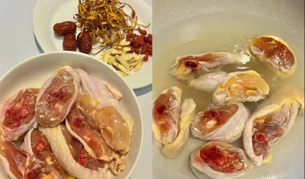 Bước 1: Sơ chế sạch các nguyên liệu gồm thịt gà, nấm đông trùng hạ thảo, táo đỏ, kỷ tử và hoàng kỳ. Sau đó cho thịt gà đã chặt và nồi nước cùng vài lát gừng, chần nhanh rồi vớt ra rửa sạch cặn bọt.