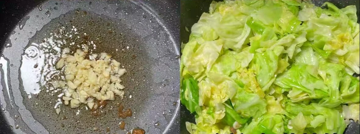 Bước 2: Phi thơm tỏi băm trong chảo với chút dầu còn lại. Sau đó cho rau bắp cải thái miếng nhỏ vào xào đến khi mềm.