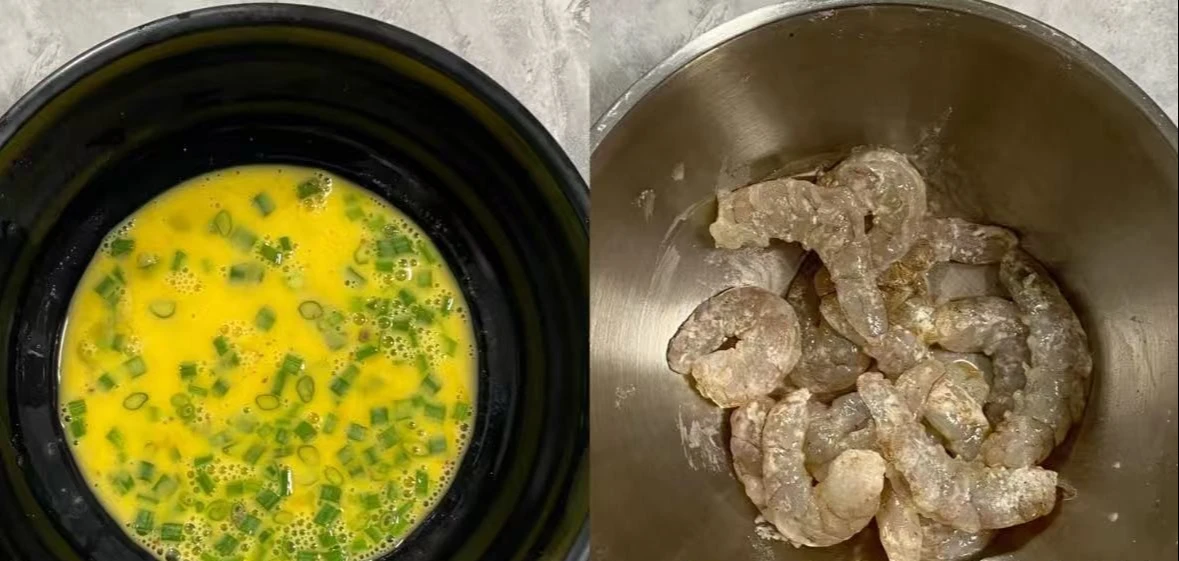 Bước 1: Đập trứng vào bát, thêm hành lá thái nhỏ, chút xíu muối, bột tiêu rồi đánh đều. Tôm rửa sạch đem bóc bỏ vỏ, rút chỉ sống lưng rồi ướp với một chút muối, bột tiêu, lượng bột bắp vừa phải.