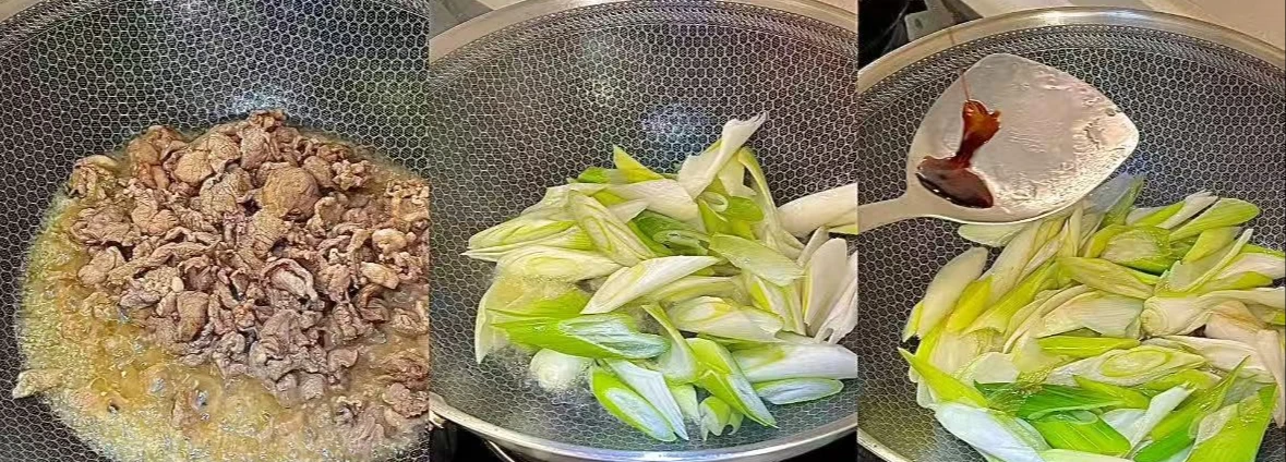 Bước 2: Đun nóng dầu trong chảo, sau đó cho thịt cừu đã ướp vào xào đến khi thịt đổi màu thì lấy ra, để dùng sau. Tiếp đó cho hành baro đã thái nhỏ vào xào, thêm một chút nước tương đen để tạo màu, đảo đều.