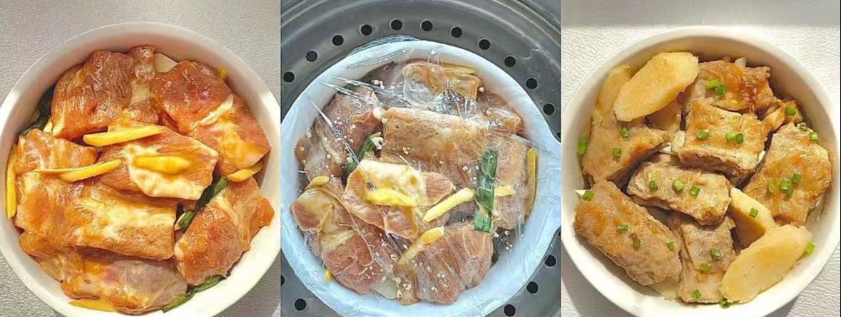Bước 3: Sau đó xếp sườn đã ướp lên trên củ mài, rồi đặt lên xửng hấp. Bật bếp rồi hấp món ăn trong khoảng 50 phút. Món ăn hoàn thành với hương thơm từ các nguyên liệu quyện với hương hành cùng gừng, rất ngon.