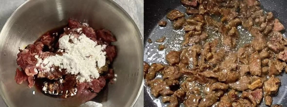 Bước 1: Thịt bò rửa sạch rồi thấm khô nước. Sau đó thái thịt bò thành các lát mỏng, cho vào bát, thêm nước tương, chút muối, bột bắp rồi trộn đều. Ướp thịt bò trong khoảng 15 phút. Đặt chảo lên bếp, thêm một chút dầu ăn vào đun nóng. Sau đó cho thịt bò vào xào một lúc đến khi đổi màu thì lấy ra, để dùng sau.