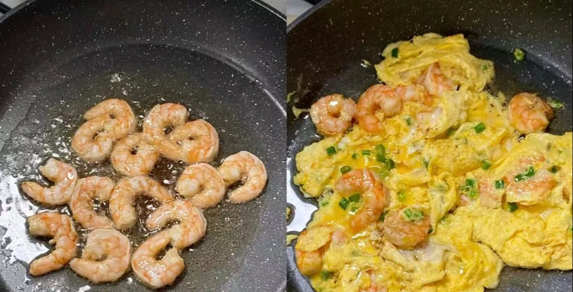 Bước 2: Đặt chảo lên bếp thêm chút dầu ăn rồi cho tôm vào xào đến khi đổi màu. Sau đó bạn đổ hỗn hợp trứng đã đánh đều vào. Để đông mặt dưới của trứng trước khi lật. Rán cho đến khi các nguyên liệu chín thì lấy ra đĩa và thưởng thức.