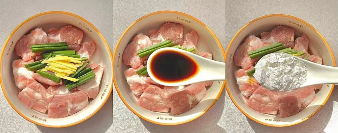 Bước 1: Rửa sạch sườn heo sau đó chặt thành các khúc ngắn vừa ăn. Sau đó cho sườn heo vào bát tô, thêm hành lá cắt khúc và gừng thái sợi vào. Tiếp đó bạn thêm nước tương, tinh bột bắp vào.