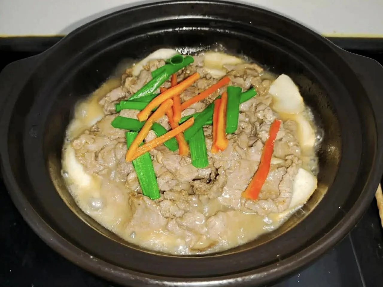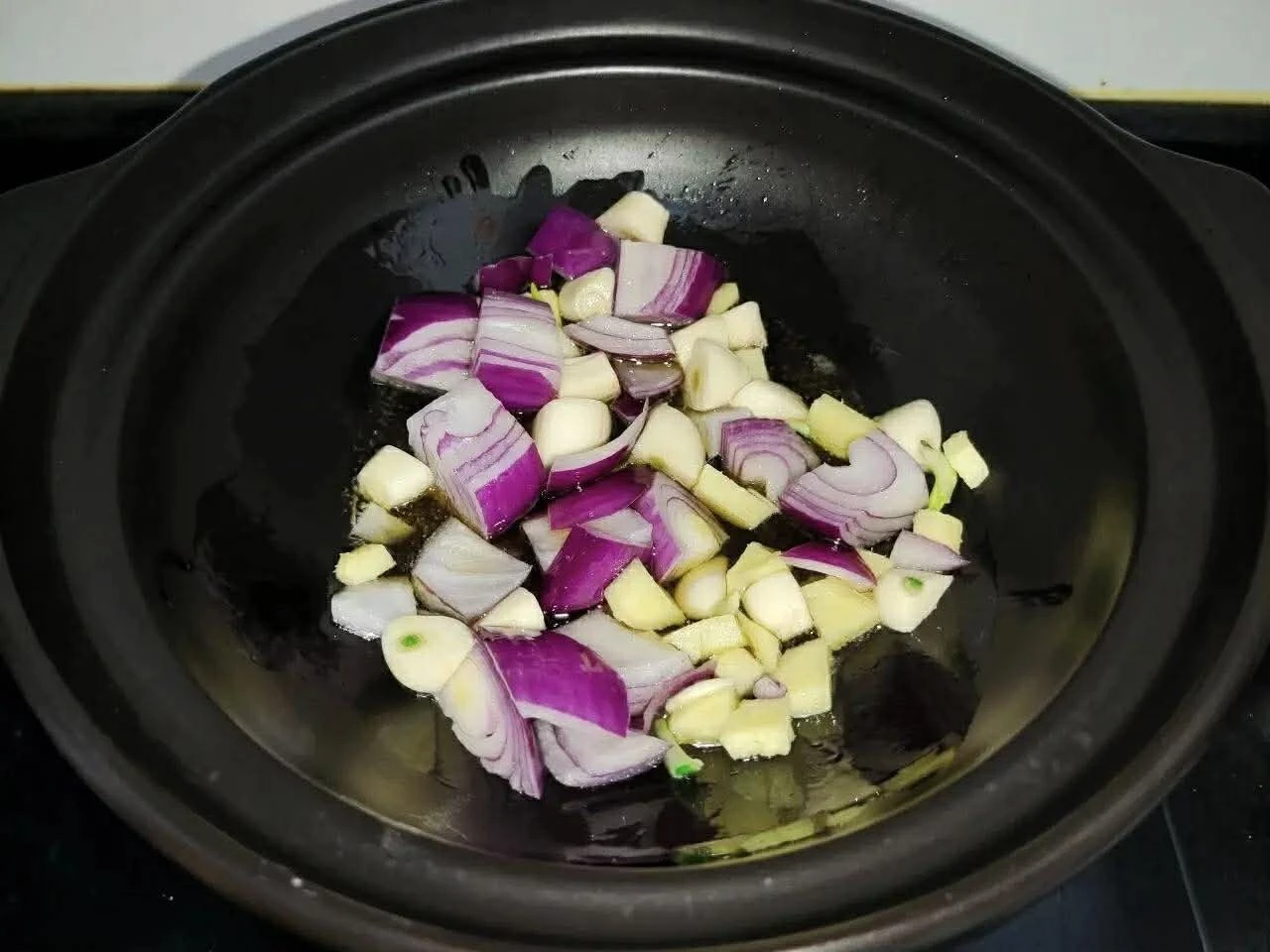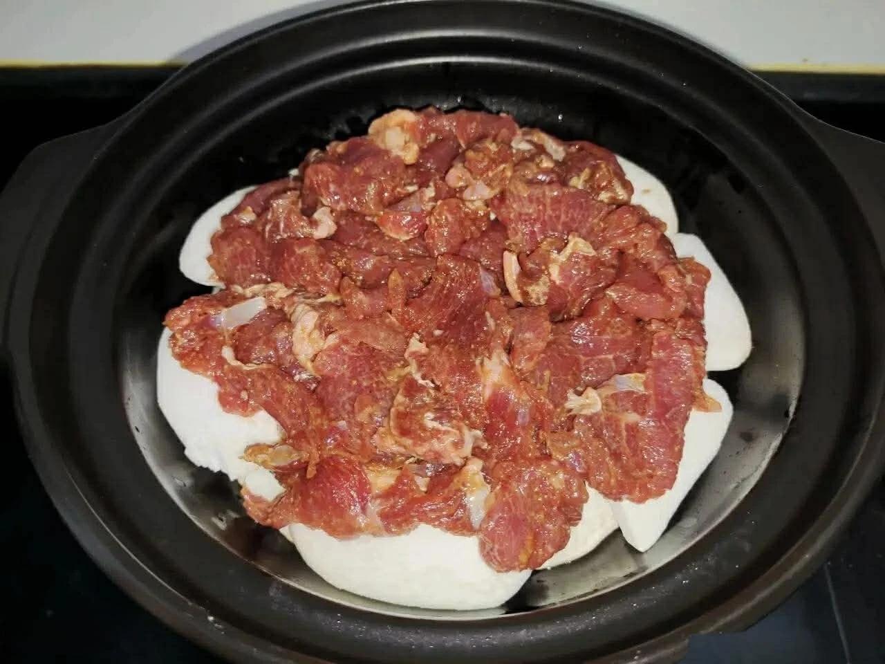 Bước 2: Sau khi chuẩn bị xong nguyên liệu, chúng ta bắt đầu nấu. Hãy chuẩn bị một chiếc nồi đất nung (hoặc nồi sứ), đặt lên bếp, đun nóng trong vài phút. Sau đó bạn cho một chút dầu ăn vào, đun nóng. Tiếp theo, cho hành tây, tỏi và gừng băm vào, xào cho đến khi dậy mùi thơm. Sau khi xào xong, dàn đều nguyên liệu trong nồi. Tiếp đó rải nấm đùi gà thái lát trực tiếp lên trên rồi thêm thịt bò đã ướp, dàn đều.
