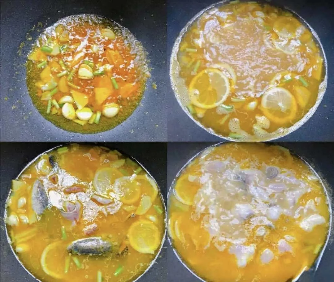 Bước 3: Sau khi xào gia vị, cho một lượng nước vừa đủ vào nồi. Khi nước sôi, cho một lượng muối vừa đủ và vài lát chanh vào. Chanh thái lát rất quan trọng, giúp nước dùng chua thanh hơn. Cho đầu cá và xương cá vào, nấu trong vài phút. Khi đầu cá và xương chín, vớt ra và cho vào bát để sẵn nấm kim châm.