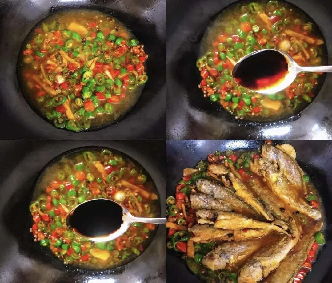 Bước 2: Sau khi chiên cá, để lại một ít dầu rồi cho hành lá, gừng, tỏi vào phi thơm. Tiếp đó cho ớt vào xào cùng đến khi dậy mùi. Tiếp đó thêm một bát nước, 1 thìa canh nước tương và 1 thìa canh nước tương đen vào rồi đun sôi.