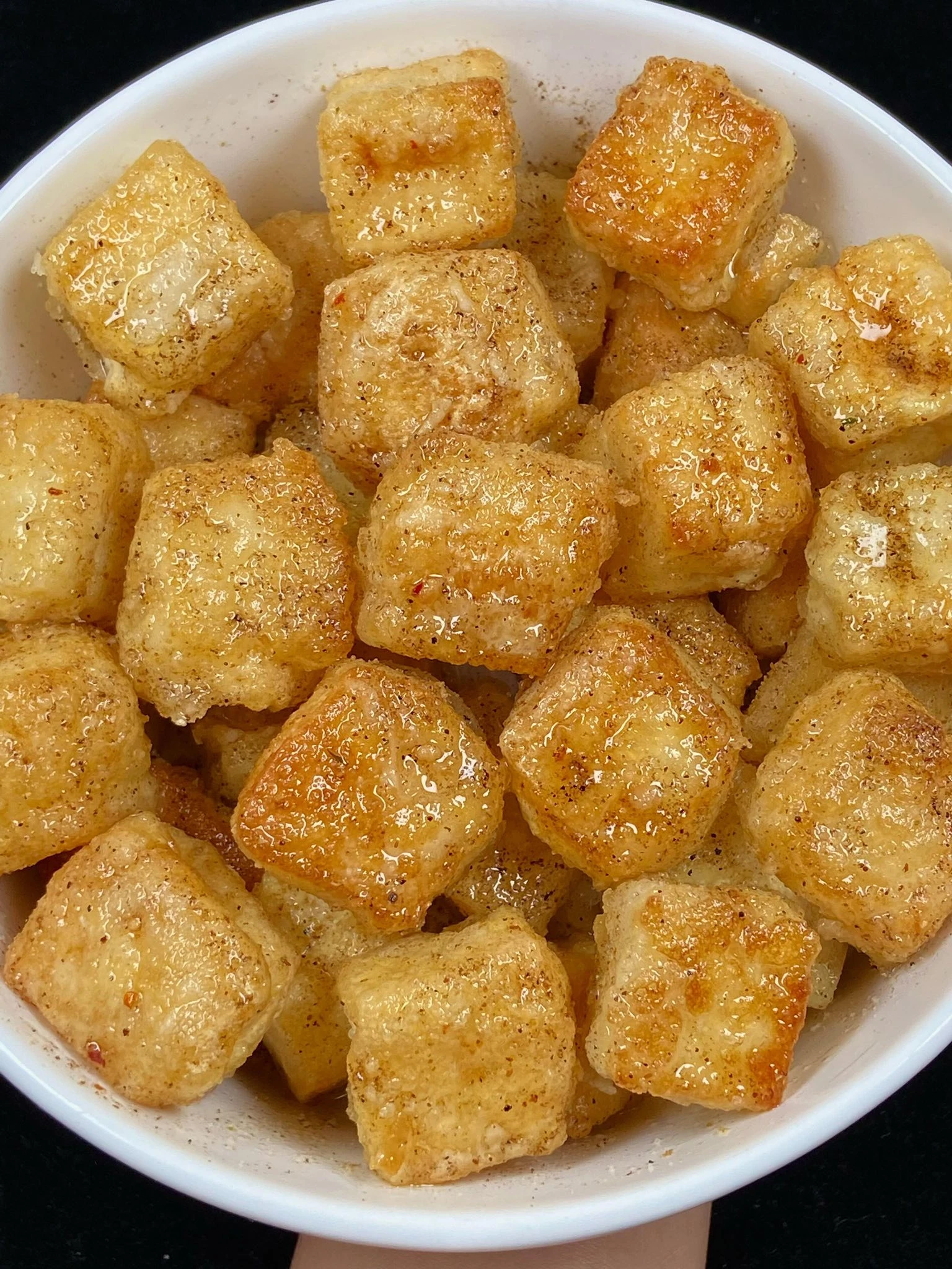 Bước 3: Vớt đậu phụ chiên ra khỏi dầu và để ráo. Khi đậu còn nóng, rắc muối, bột tiêu và bột ớt (nếu không ăn cay thì bỏ bột ớt). Trộn đều là hoàn thành.
