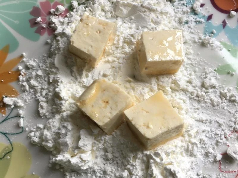 Bước 1: Đậu phụ cắt thành khối vuông nhỏ có kích thước khoảng 2cm. Sau đó lăn qua bột bắp sao cho phủ đều một lớp mỏng.