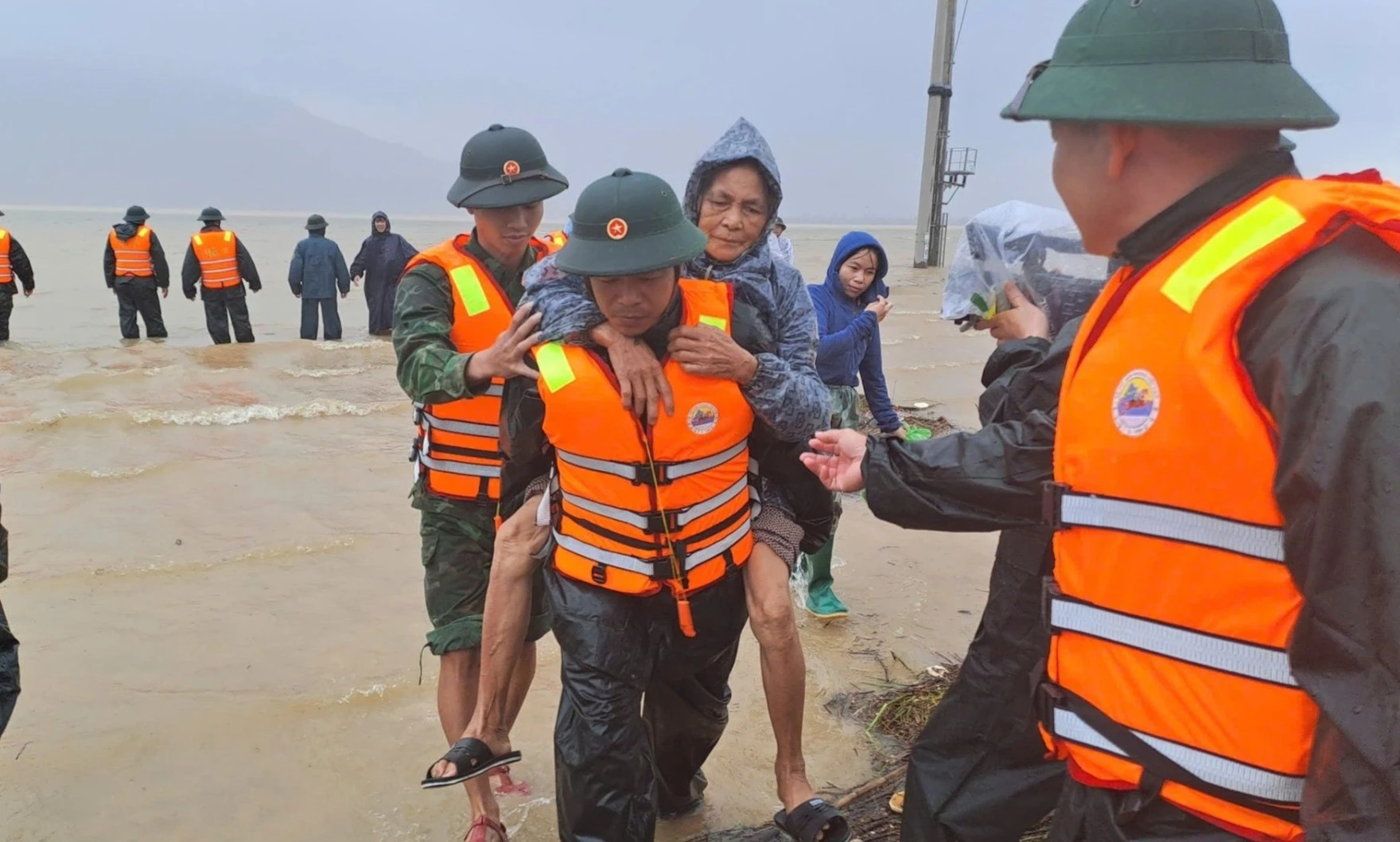 Lực lượng chức năng cõng dân qua khu vực bị ngập sâu. Ảnh: CTV