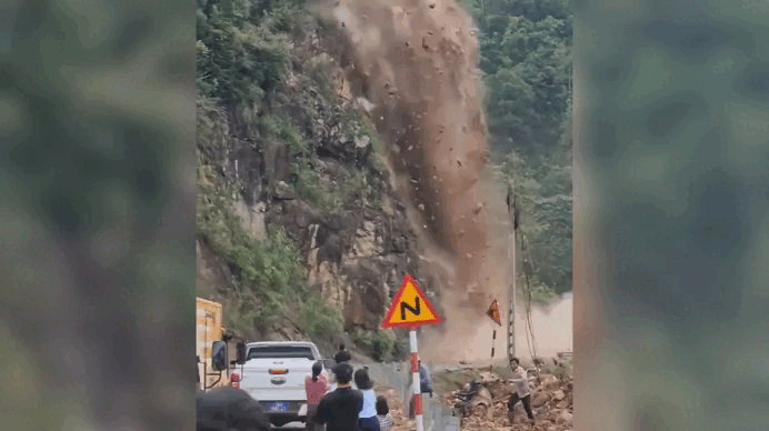 Khoảnh khắc đất đá sạt lở trên Quốc lộ 4G. Ảnh cắt từ clip