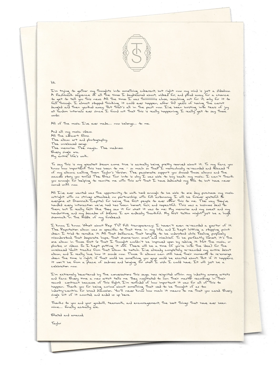 "Không biết phải cảm ơn mọi người thế nào cho đủ vì đã giúp mình lấy lại được với những tác phẩm mà mình đã dành cả thanh xuân để tạo nên. Những điều tuyệt vời nhất từng thuộc về mình... giờ đã thực sự là của mình" , Taylor chia sẻ trong bức tâm thư, ăn mừng vì đã giành lại được bao mồ hôi và công sức kể từ khi bắt đầu sự nghiệp ca hát.