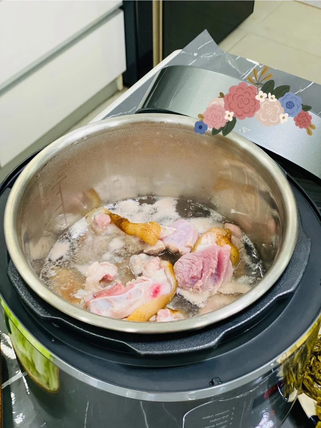 Sơ chế chân giò và xương ống: Chân giò rửa sạch, chà với muối, gừng đập dập rồi chặt khoanh vừa ăn. Xương ống chần qua nước sôi 3-5 phút để loại bỏ tạp chất, sau đó rửa lại bằng nước sạch.