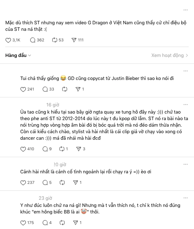 Ngay, G-Dragon trở lại Việt Nam sau 13 năm. Càng ngắm G-Dragon thì dân tình lại càng thấy sự tương đồng với Sơn Tùng. Từ bộ ảnh G-Dragon khoe visual mộc, tóc hồng nổi bật ở khách sạn, Sơn Tùng đã bị "réo tên". Xem G-Dragon trình diễn tại Mỹ Đình, sự so sánh này càng gia tăng và rõ ràng hơn bao giờ hết. Thậm chí khi ghép nhạc Sơn Tùng vào video sân khấu của GD, mọi thứ cũng rất hợp lý. Anh Long sang Việt Nam, cư dân mạng gật gù: Đúng là Sơn Tùng quá giống G-Dragon!