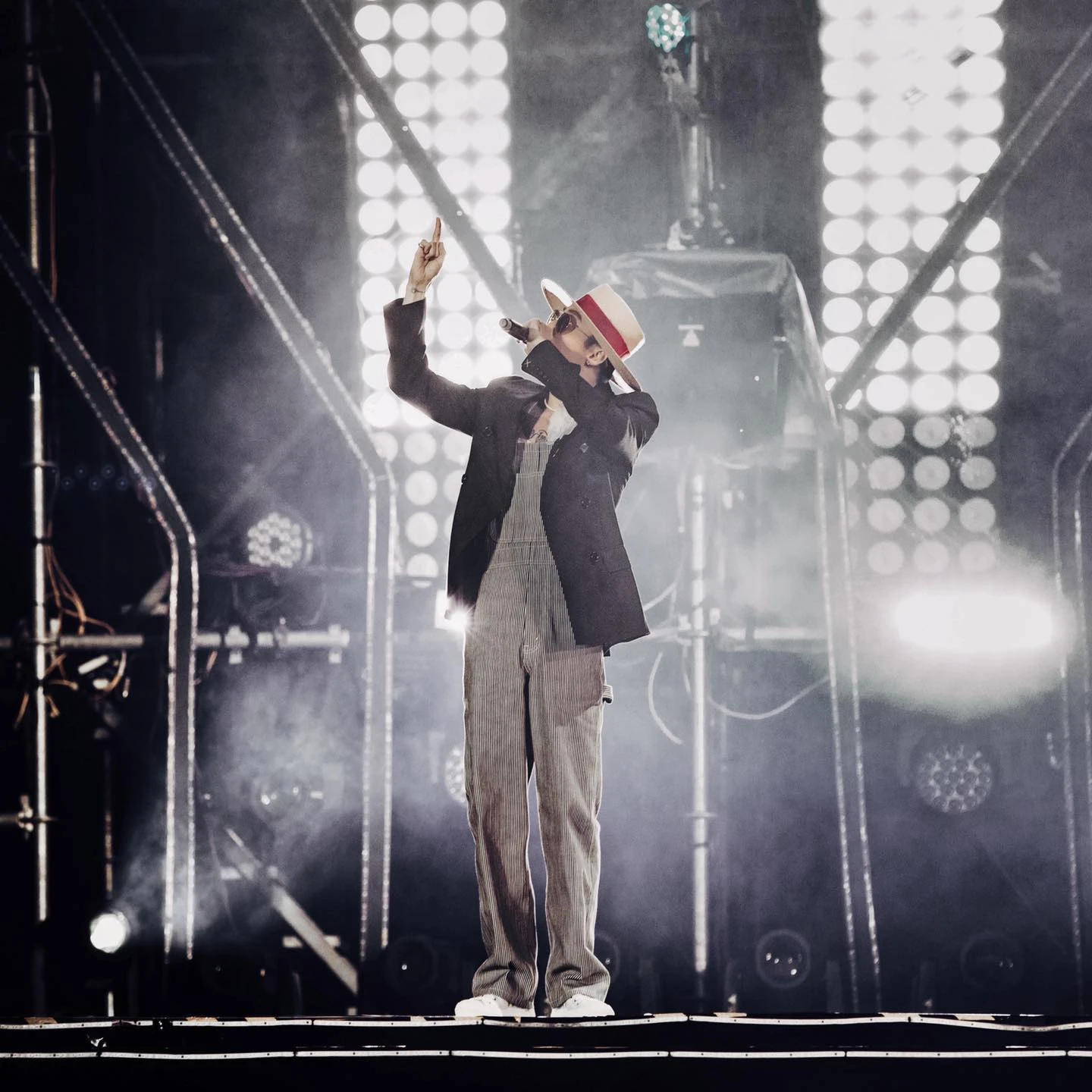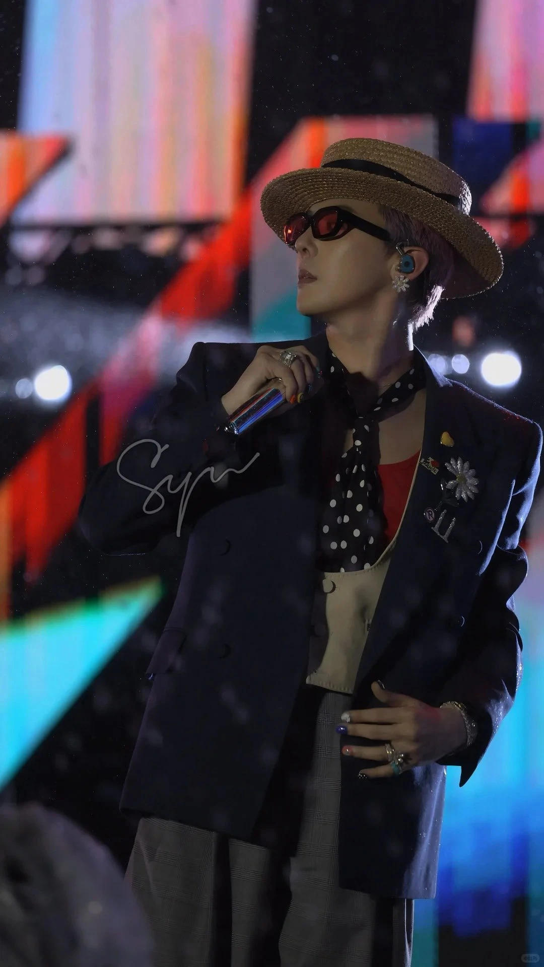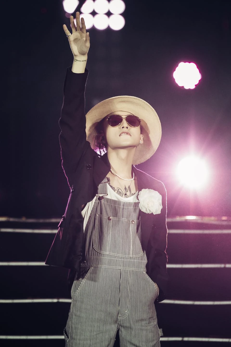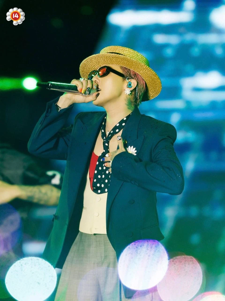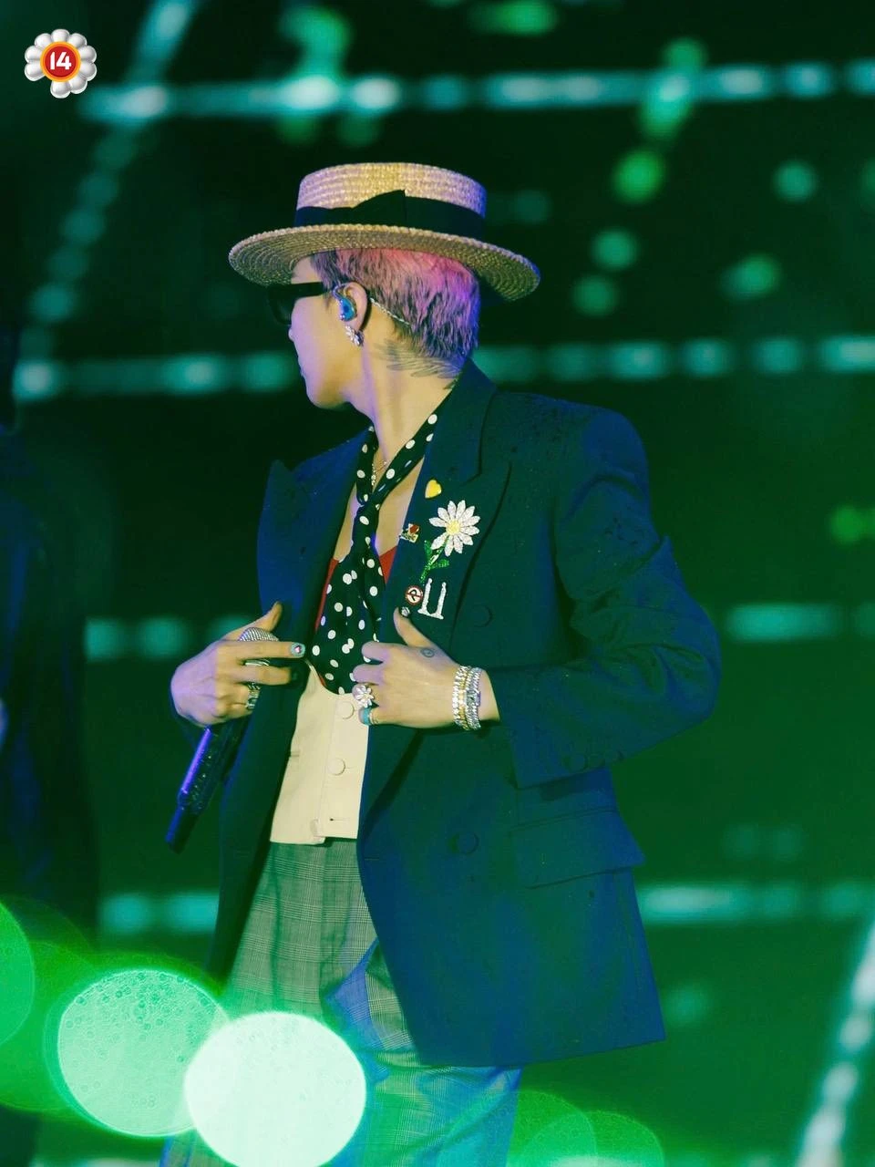 G-Dragon xuất hiện trước hàng chục nghìn fan Mỹ Đình với giao diện lịch lãm, bắt mắt, dát đồ hiệu từ chân đến đầu. G-Dragon diện bộ suit thanh lịch, mũ cói rộng vành và điểm nhấn là chiếc pin cài áo hoa cúc khuyết cánh đính kim cương giá bạc tỷ. Bộ cánh trông đơn giản nhưng toát lên thần thái và đẳng cấp của ngôi sao số 1 Hàn Quốc. Đây cũng là phong cách GD ưa chuộng dạo gần đây, anh diện combo này ở loạt sự kiện ra mắt nhãn hàng quan trọng, đưa lên cả sân khấu tour Ubermensch và là tạo hình "đinh" cho ca khúc Too Bad.