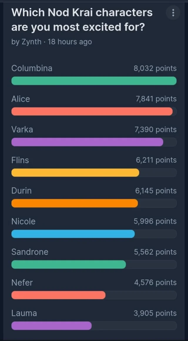Đứng đầu bảng xếp hạng là Columbina với 8.032 điểm, trở thành nhân vật được game thủ mong đợi nhất trong đợt cập nhật Luna. Sự tò mò về quá khứ bí ẩn cùng phong thái lạnh lùng của cô nàng được xem là yếu tố khiến người chơi khó lòng rời mắt. Không kém cạnh, Alice – cái tên vốn đã nổi tiếng từ lâu trong lore của Teyvat – đang bám sát phía sau với 7.841 điểm. Việc Alice cuối cùng cũng chuẩn bị xuất hiện chính thức trong game sau nhiều năm “úp mở” rõ ràng là một tin cực kỳ đáng mừng với cộng đồng.