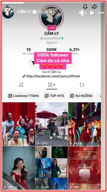 Trên trang cá nhân, mới đây ca sĩ Cẩm Ly đã thu hút sự chú ý của khán giả khi đăng tải hình ảnh chụp màn hình kênh TikTok của mình, kèm theo dòng trạng thái thông báo tài khoản chính thức chạm mốc 500.000 người theo dõi. Với nhiều người hâm mộ, đây không chỉ là một con số đáng nhớ mà còn là cột mốc mang nhiều ý nghĩa, đánh dấu sự hiện diện ngày càng rõ nét của một nghệ sĩ gạo cội trên nền tảng mạng xã hội vốn được xem là "sân chơi" của thế hệ trẻ.