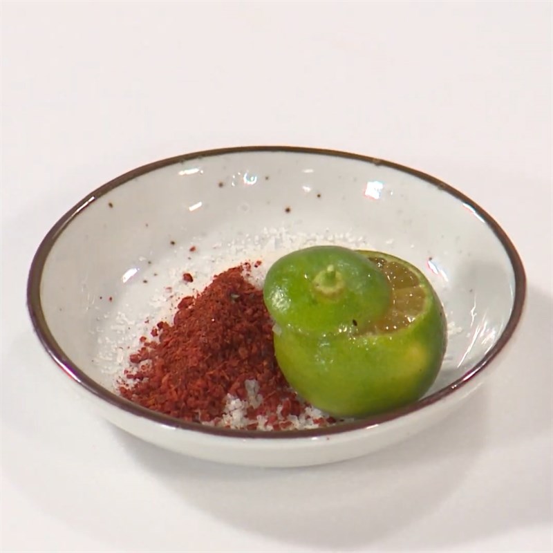 Để làm nước chấm tắc, bạn cho vào chén chấm 1 muỗng bột canh, nửa muỗng bột ớt, để sẵn 1 miếng tắc cắt sẵn.