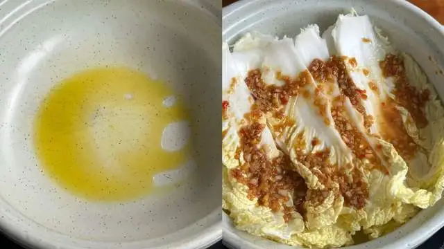 Quét một lớp dầu mỏng ở đáy nồi, xếp cải thảo đã rửa sạch vào, những lá to có thể xé nhỏ. Rắc một ít muối, thêm một thìa sốt tỏi. Vì sốt tỏi đã mặn sẵn, nên nên nêm nếm cẩn thận.