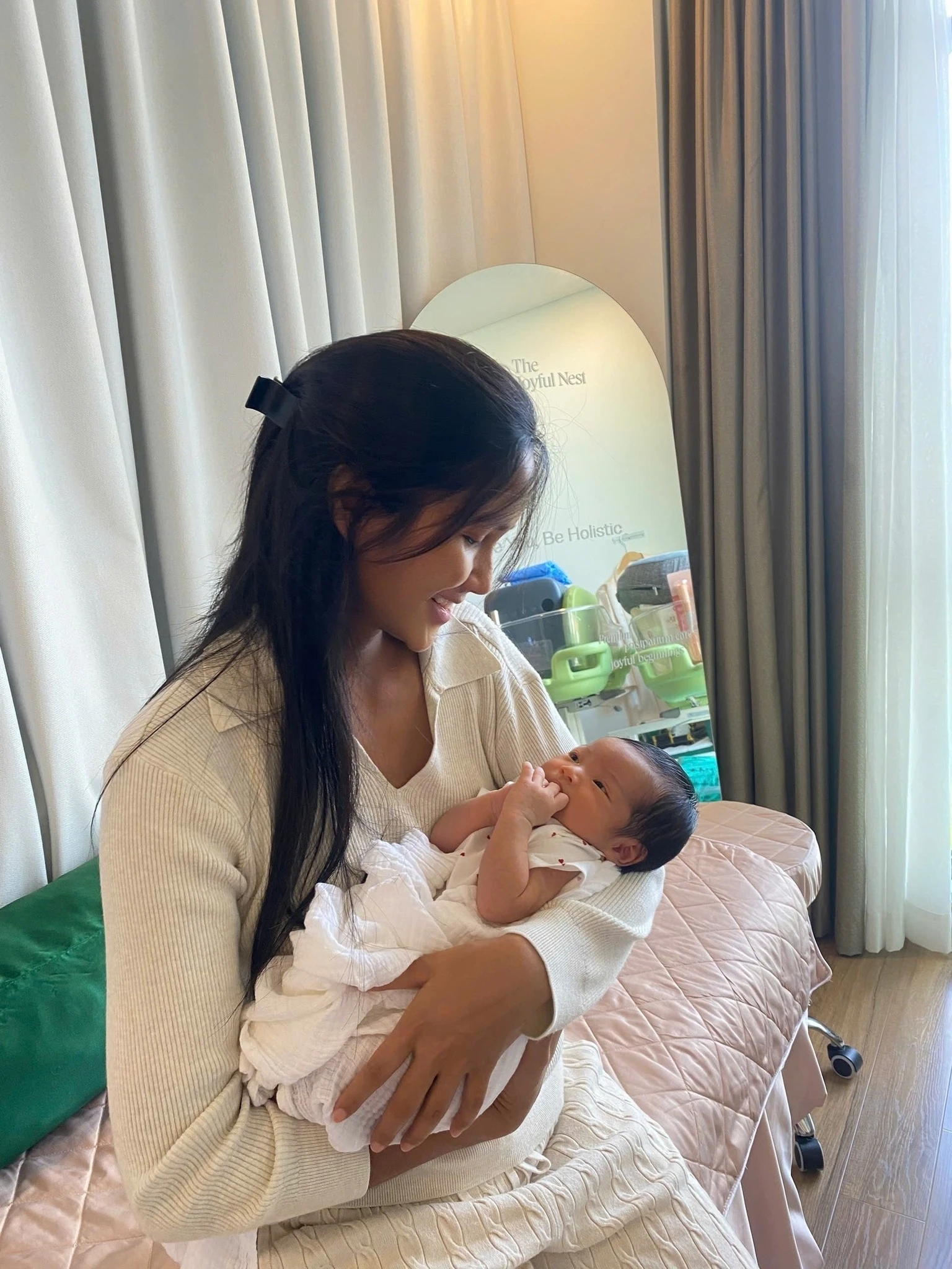 Người đẹp cho biết, trong giai đoạn ở trung tâm chăm sóc mẹ sau sinh, cô cảm thấy rất khỏe mạnh và tươi tắn. Tuy nhiên, khi trở về nhà, do bận rộn với việc nội trợ và chăm con nhỏ, cô không còn nhiều thời gian nghỉ ngơi nên cơ thể phản ứng, dẫn đến tình trạng sưng phù và mẩn ngứa.