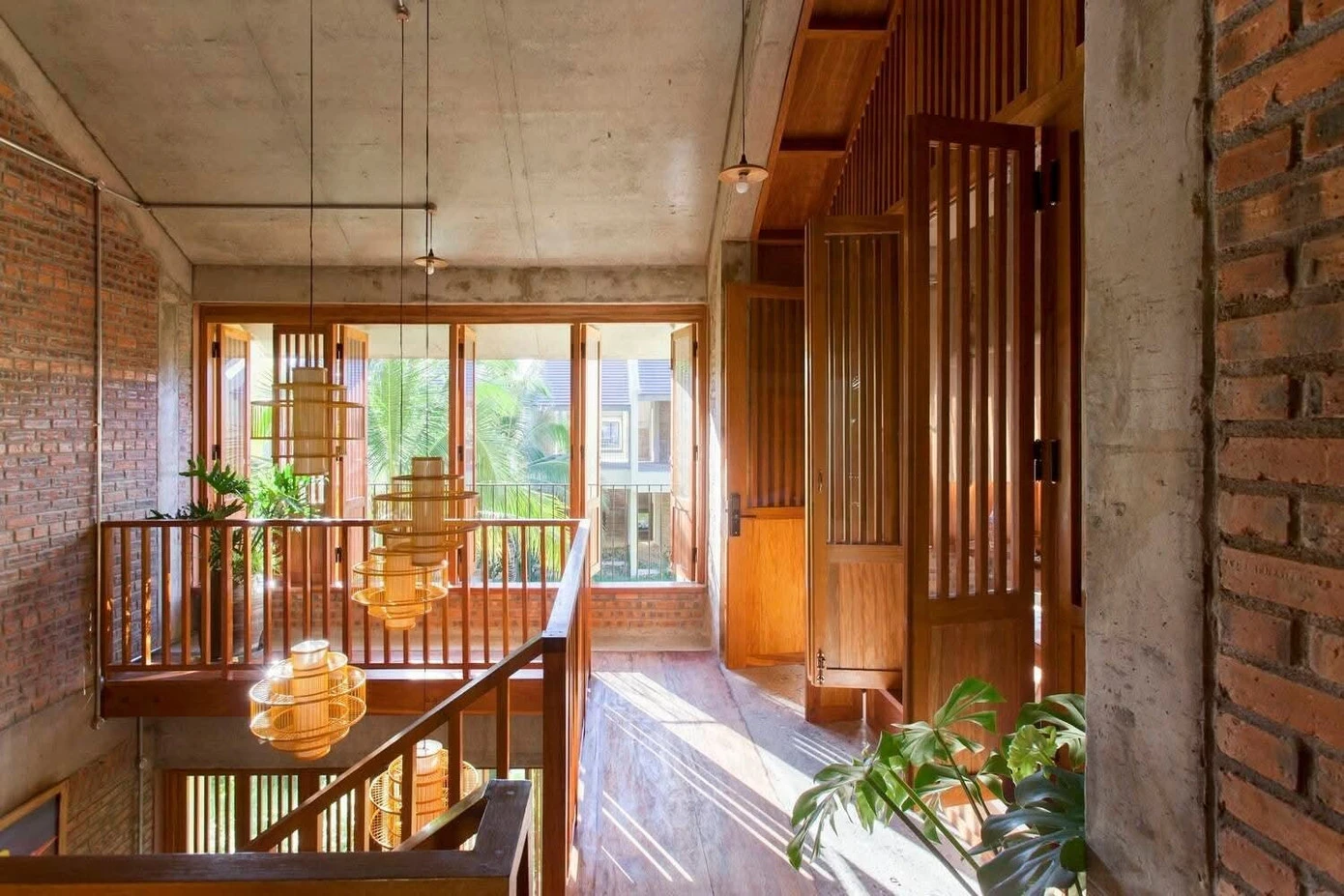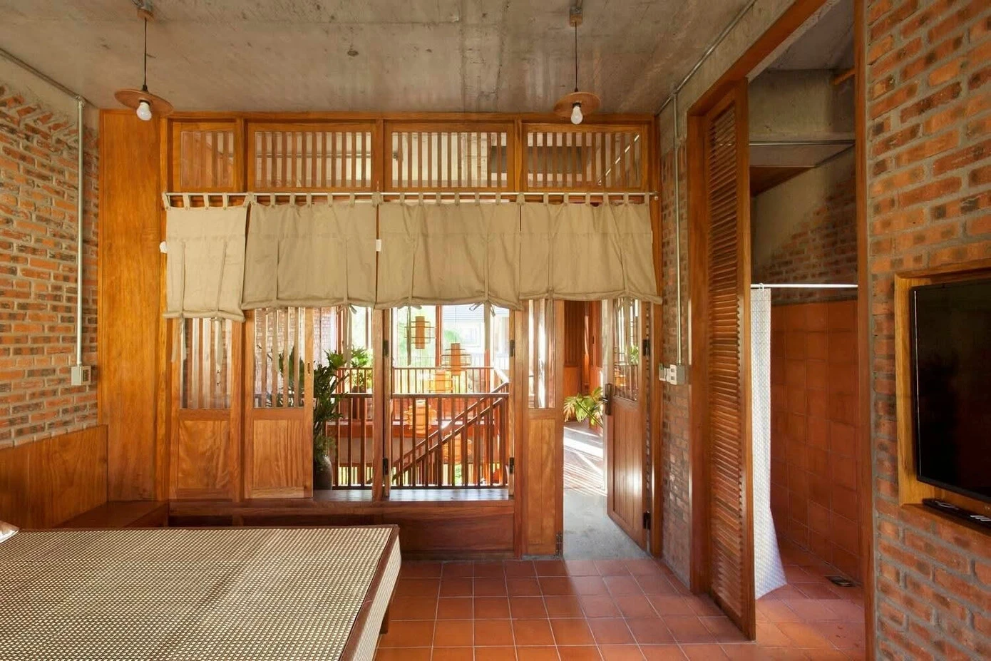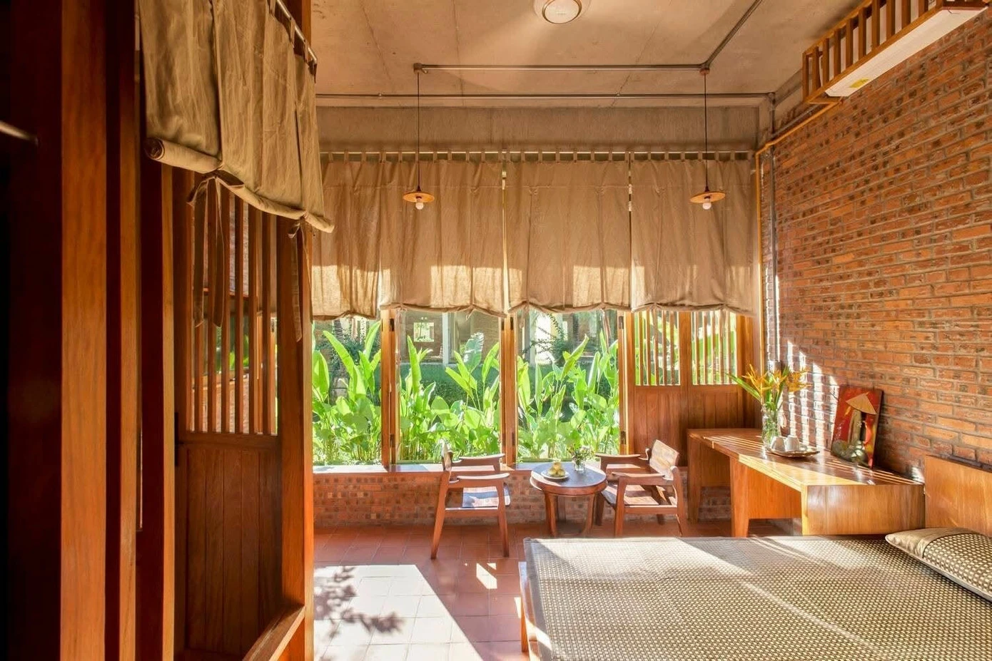 Toàn bộ không gian từ tầng 1 lên tầng 2 đều thoáng mở và được bao trùm bằng ánh sáng tự nhiên và chất cảm mộc mạc của tường gạch , gỗ và vải mộc.