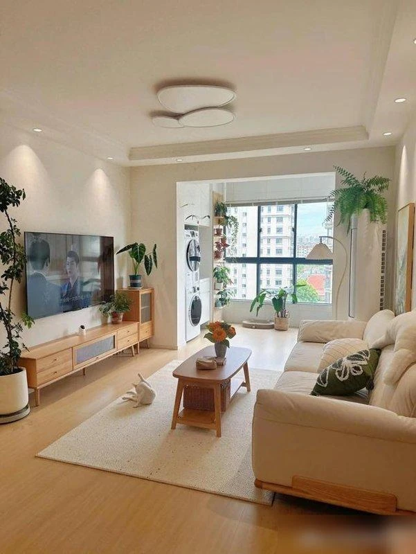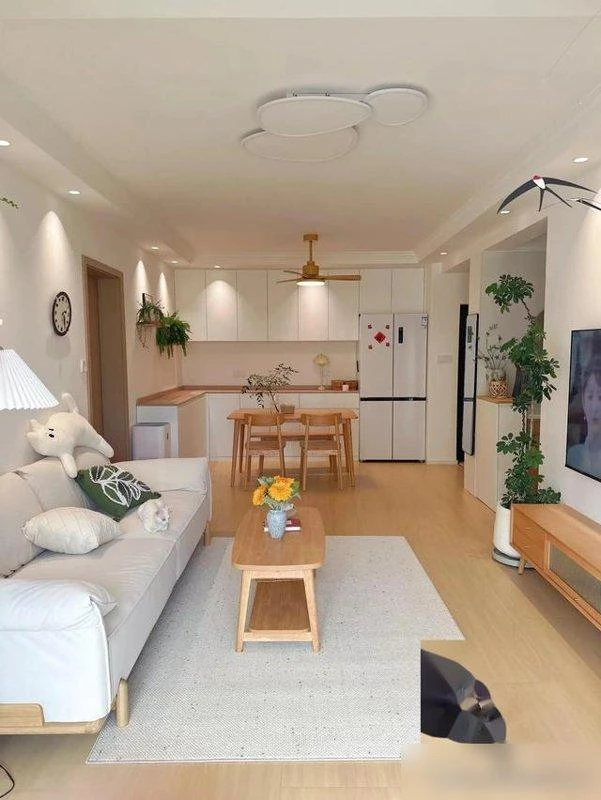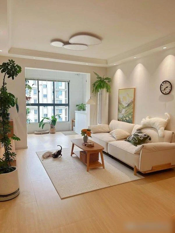 Căn hộ của chị được giữ nền trắng, kết hợp nội thất gỗ ấm áp. Sàn gỗ nguyên bản, tường trắng phản chiếu ánh sáng, mang lại cảm giác nhẹ nhàng dù trời nhiều mây.