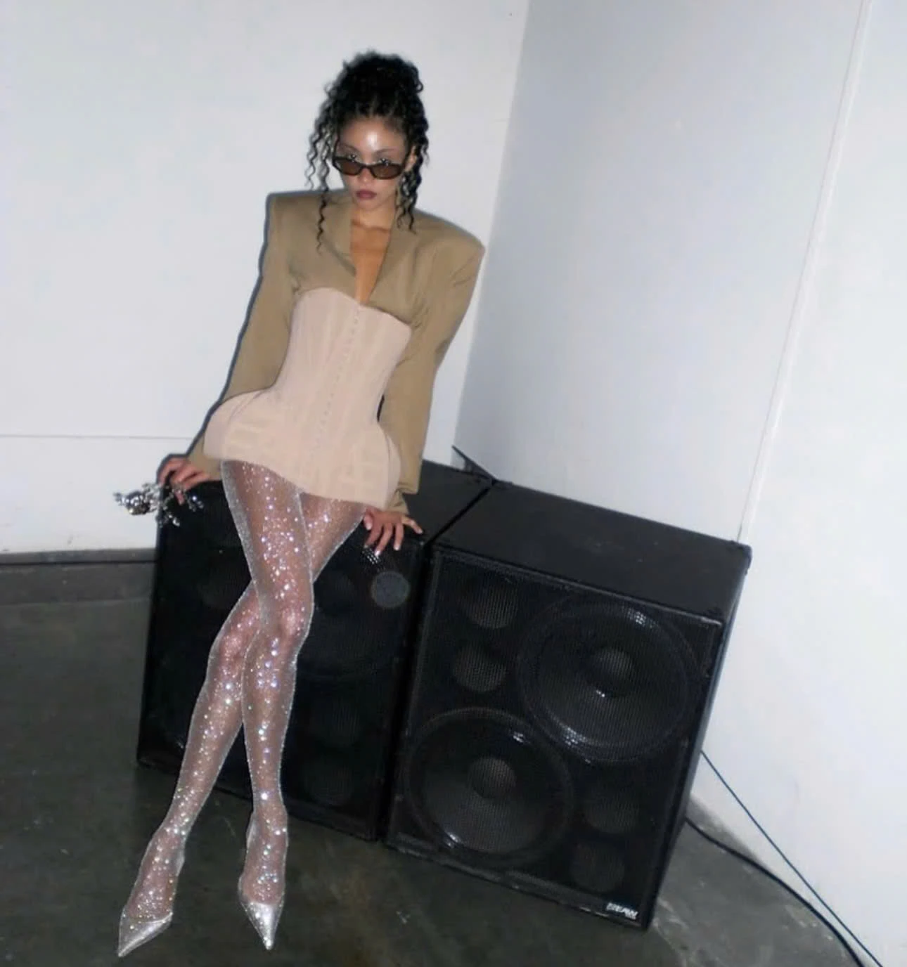 Quần tất lấp lánh là món đồ nâng tầm trang phục tiệc tối. Thiết kế ánh nhũ tạo hiệu ứng thị giác, giúp Tina Dimkovska nổi bật dưới ánh đèn. Khi phối cùng corset và blazer dáng cấu trúc, tổng thể không chỉ gợi cảm mà còn toát lên vẻ quyền lực