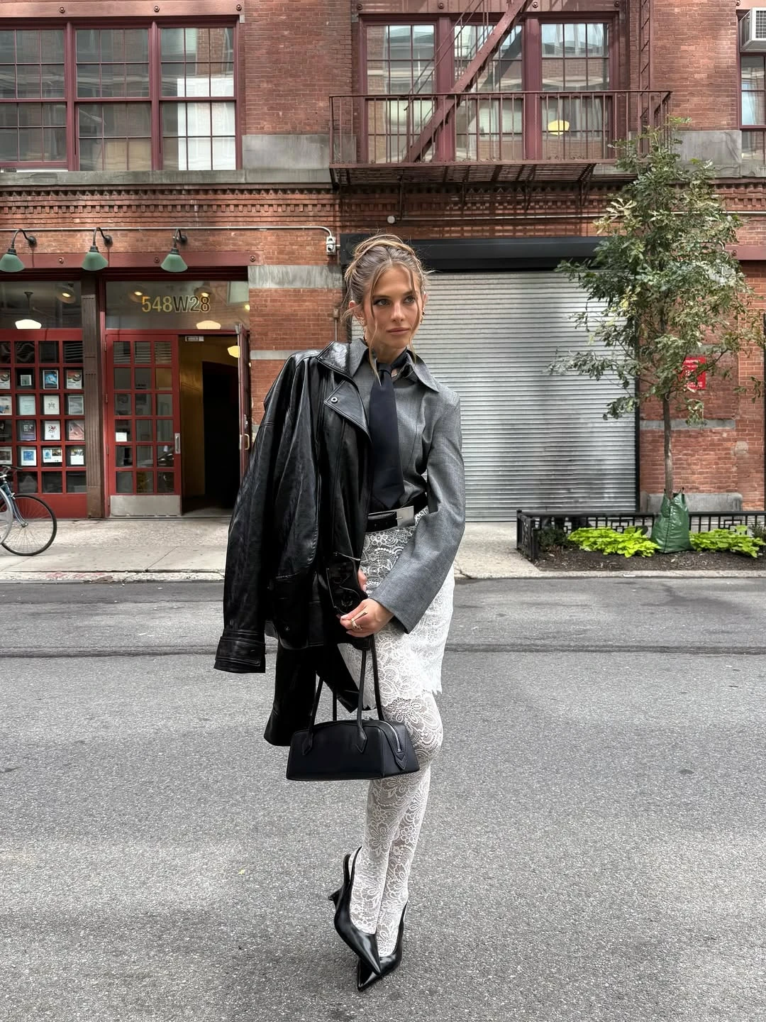 Quần tất ren mang đến sự lãng mạn ngay cả trong những ngày đông lạnh giá. Người đẹp Hannah Porter mang đến bản phối phá cách với áo khoác da và sơ mi oversized để tạo nên sự đối lập đầy cuốn hút giữa mềm mại và mạnh mẽ