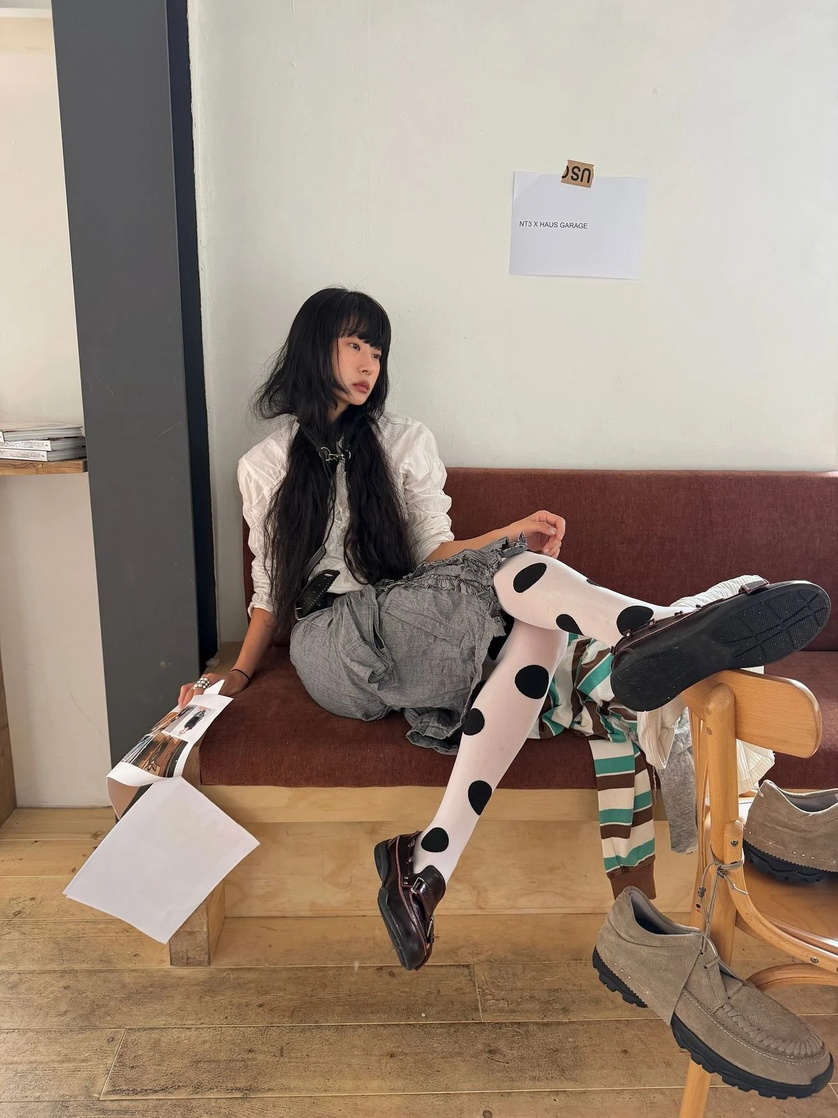 Nếu muốn thêm chút tinh nghịch, quần tất chấm bi là lựa chọn lý tưởng. Những nét chấm phá dưới chân váy midi và áo khoác tối giản có thể tạo nên hình ảnh thú vị, đem đến điểm nhấn mềm mại mà không gây rối mắt cho người đẹp Lee Soomin