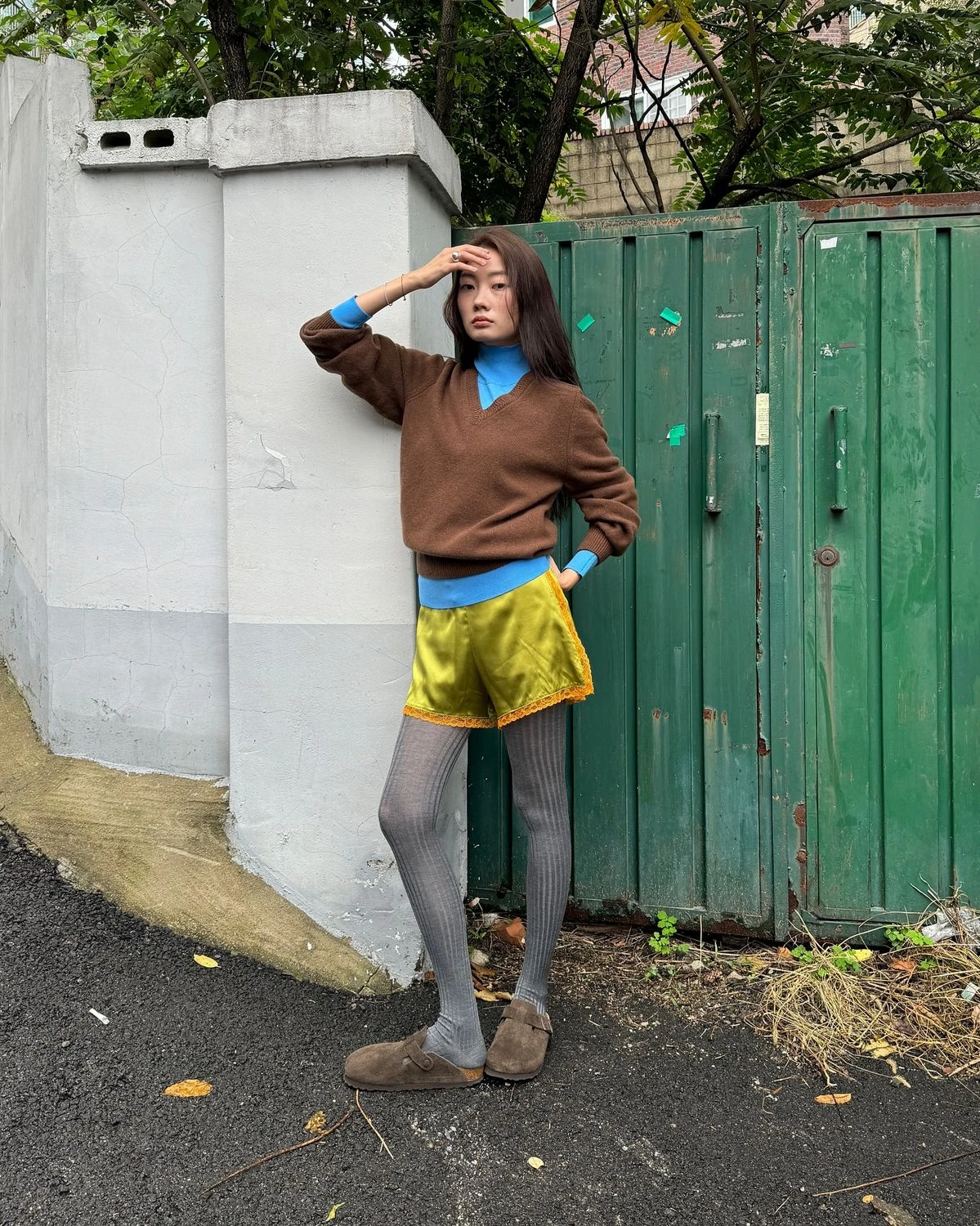 Bên cạnh khả năng giữ ấm hiệu quả, quần tất còn tạo điểm nhấn thị giác. Minjoo Park áp dụng phong cách nội y với quần lụa vàng satin, layer áo cổ lọ và áo len dáng rộng. Sự đối lập giữa chất liệu cùng bảng màu sặc sỡ tạo nên tổng thể cá tính