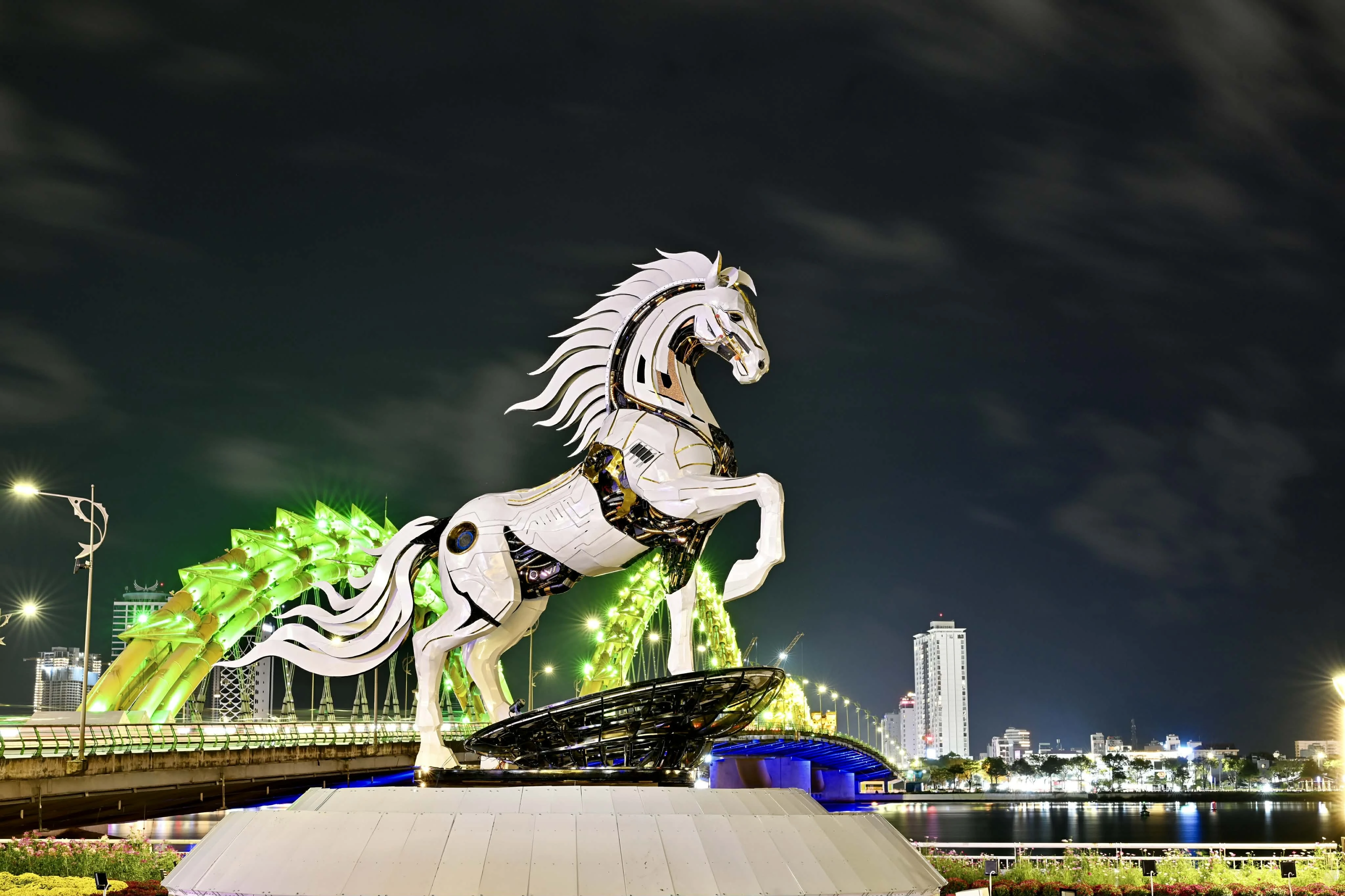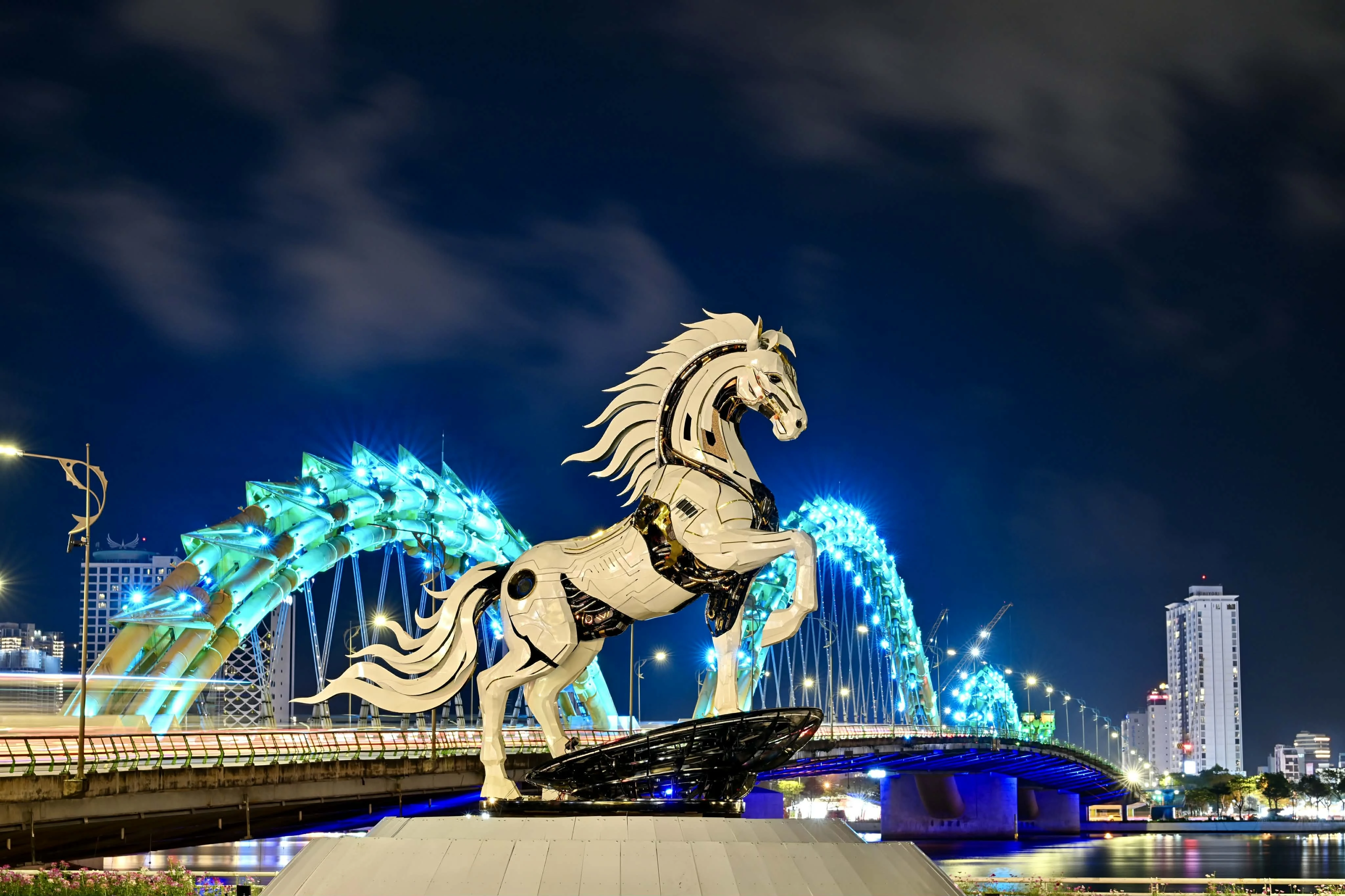 "Kim Mã 4.0" được đặt ở khu vực sàn cảnh quan phía Nam cầu Rồng (Đà Nẵng) đang là một trong những tác phẩm dẫn đầu trong "cuộc đua" linh vật Tết Nguyên đán 2026. Tối 6/1, hình ảnh đẹp huyền ảo của chú ngựa dưới bóng trăng khuyết được nhiếp ảnh gia Moon Black ghi lại. Lớp ngoài màu trắng bạc của "Kim Mã 4.0" dường như phát sáng dưới ánh đèn đêm, tạo nên hiệu ứng ấn tượng.