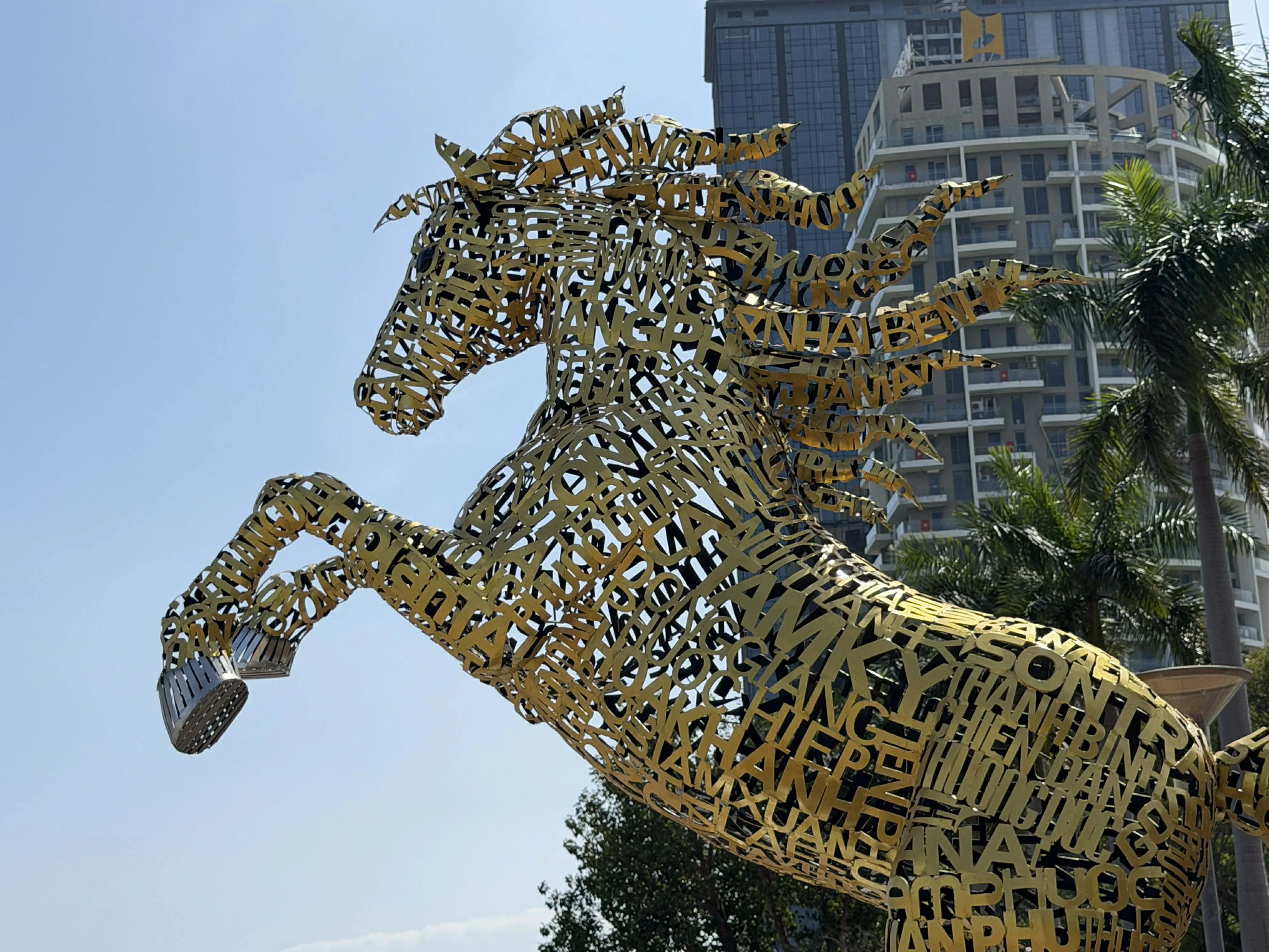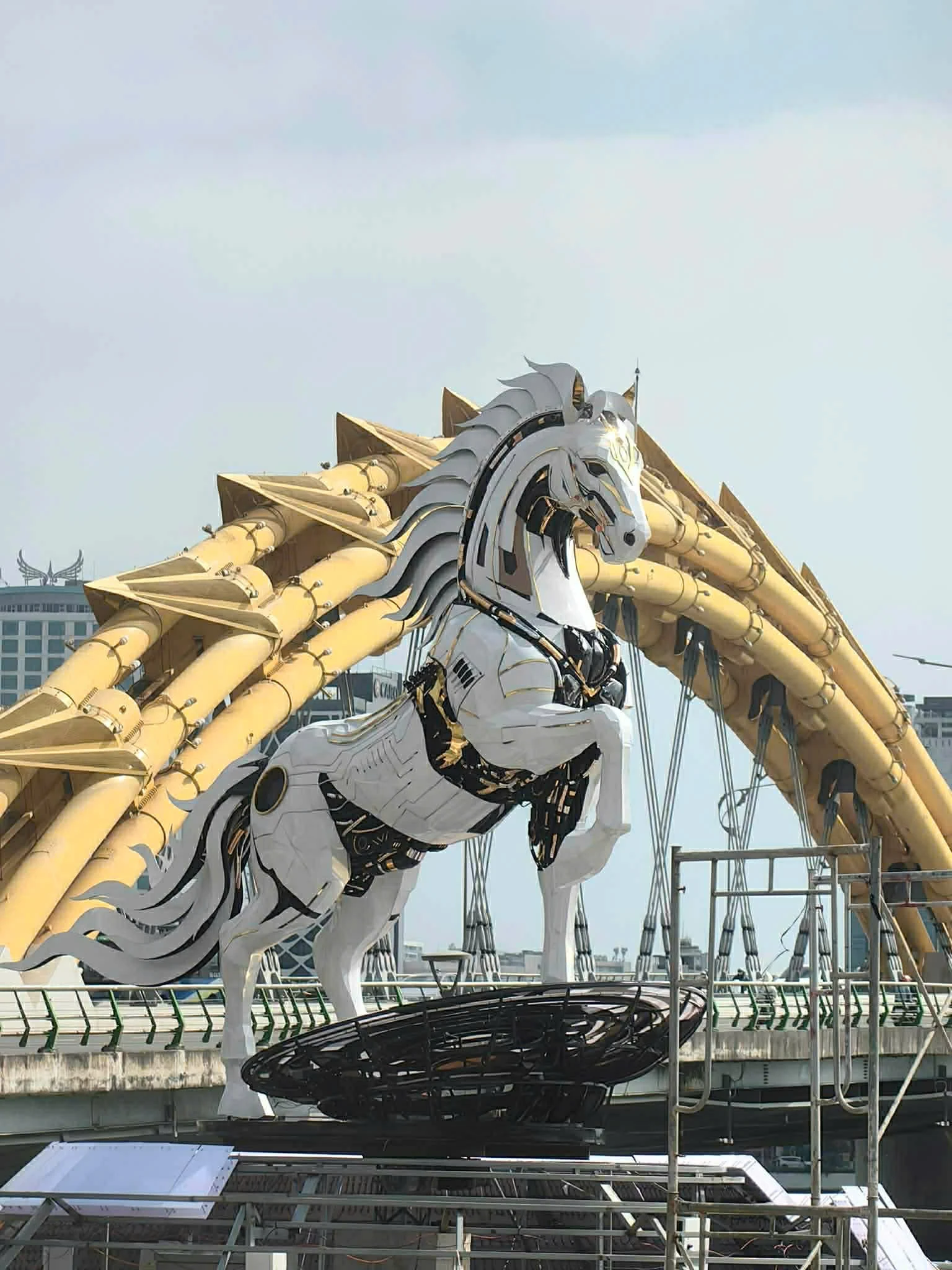 Dưới ánh sáng ban ngày, người dân có thể nhìn rõ màu trắng cùng các đường nét của linh vật ngựa. Tác phẩm có kích thước lớn, cao khoảng 4,3 m, dài hơn 5 m, cao nổi bật giữa bối cảnh công viên với lưng hướng về cầu Rồng, tạo thế uy nghi.