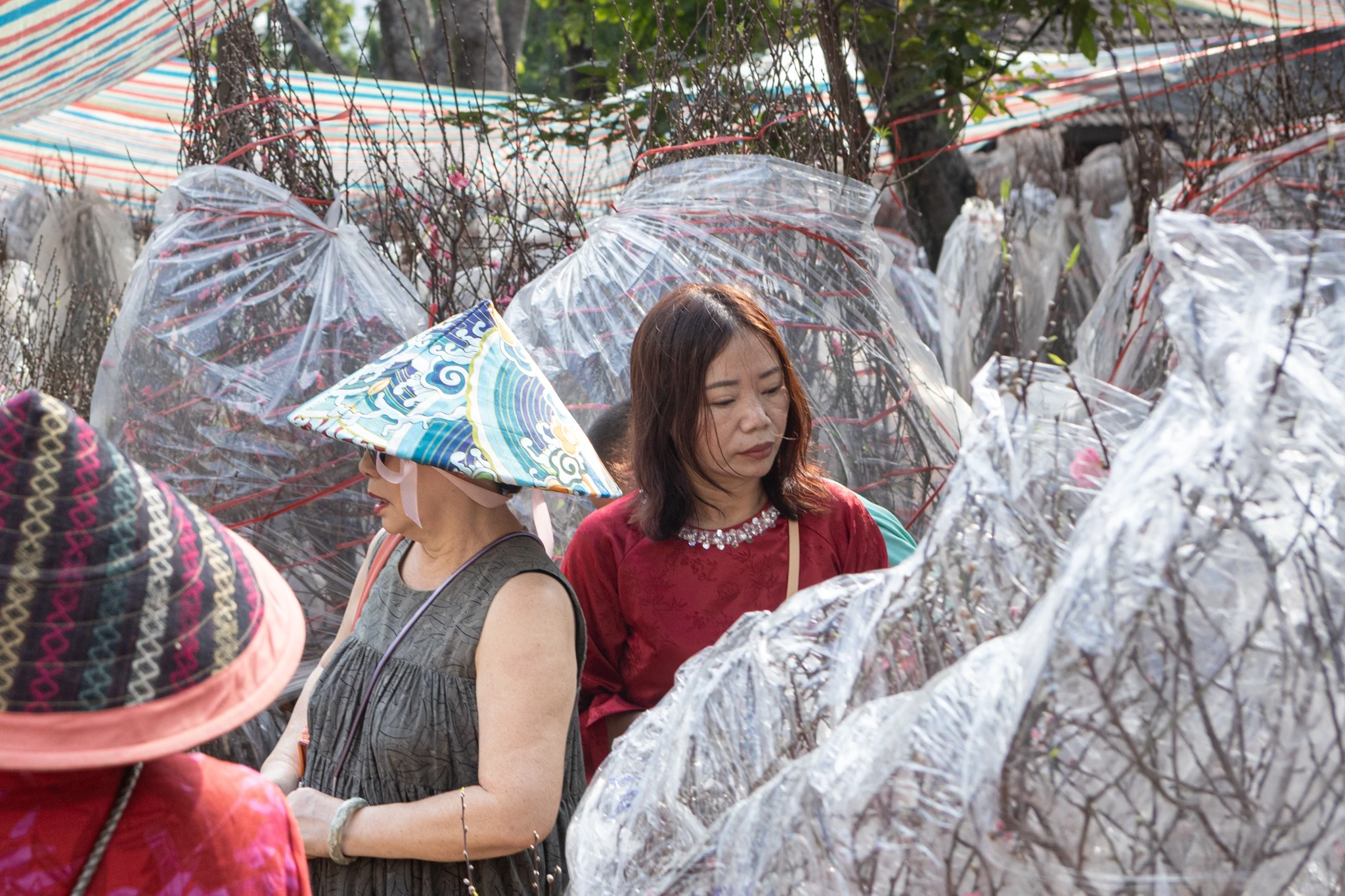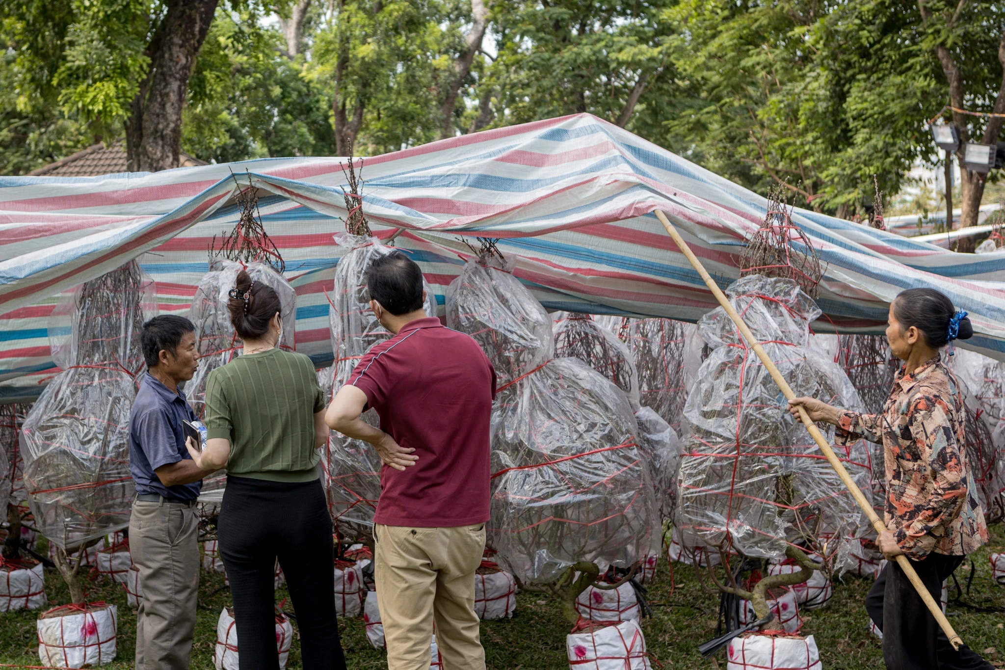 Giữa không gian chợ hoa, gian hàng của bà Phương Thị Hải Yến thu hút sự chú ý khi trưng bày 10 cây đào cổ thụ, được chăm sóc trên 10 năm. Mức giá được chào bán là hơn 100 triệu đồng/cây. Bà Yến cho biết một số cây đã có khách đặt trước, số còn lại vẫn đang được bán. “Nhiều khách đến hỏi thuê cây trong dịp Tết, nhưng tôi chỉ cho bán chứ không cho thuê”, bà nói.