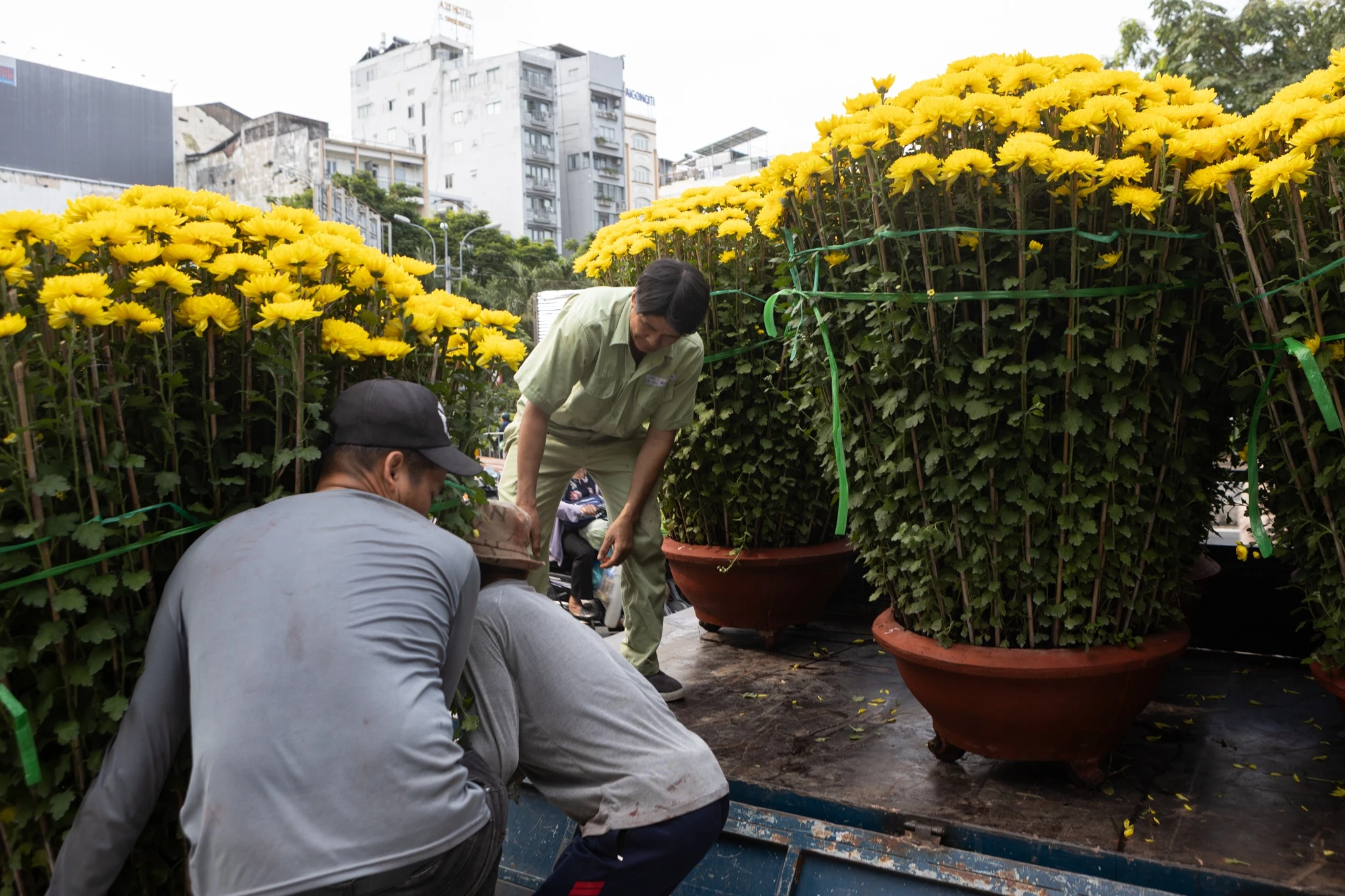 Theo khảo sát, bên cạnh đào và mai, các chậu cúc cỡ lớn cũng được đưa từ các tỉnh về TP.HCM với số lượng đáng kể. Giá cúc năm nay dao động 200.000-400.000 đồng/chậu đối với loại nhỏ, trong khi các chậu cỡ lớn có giá từ 1,5 triệu đến hơn 10 triệu đồng, tùy kích thước.