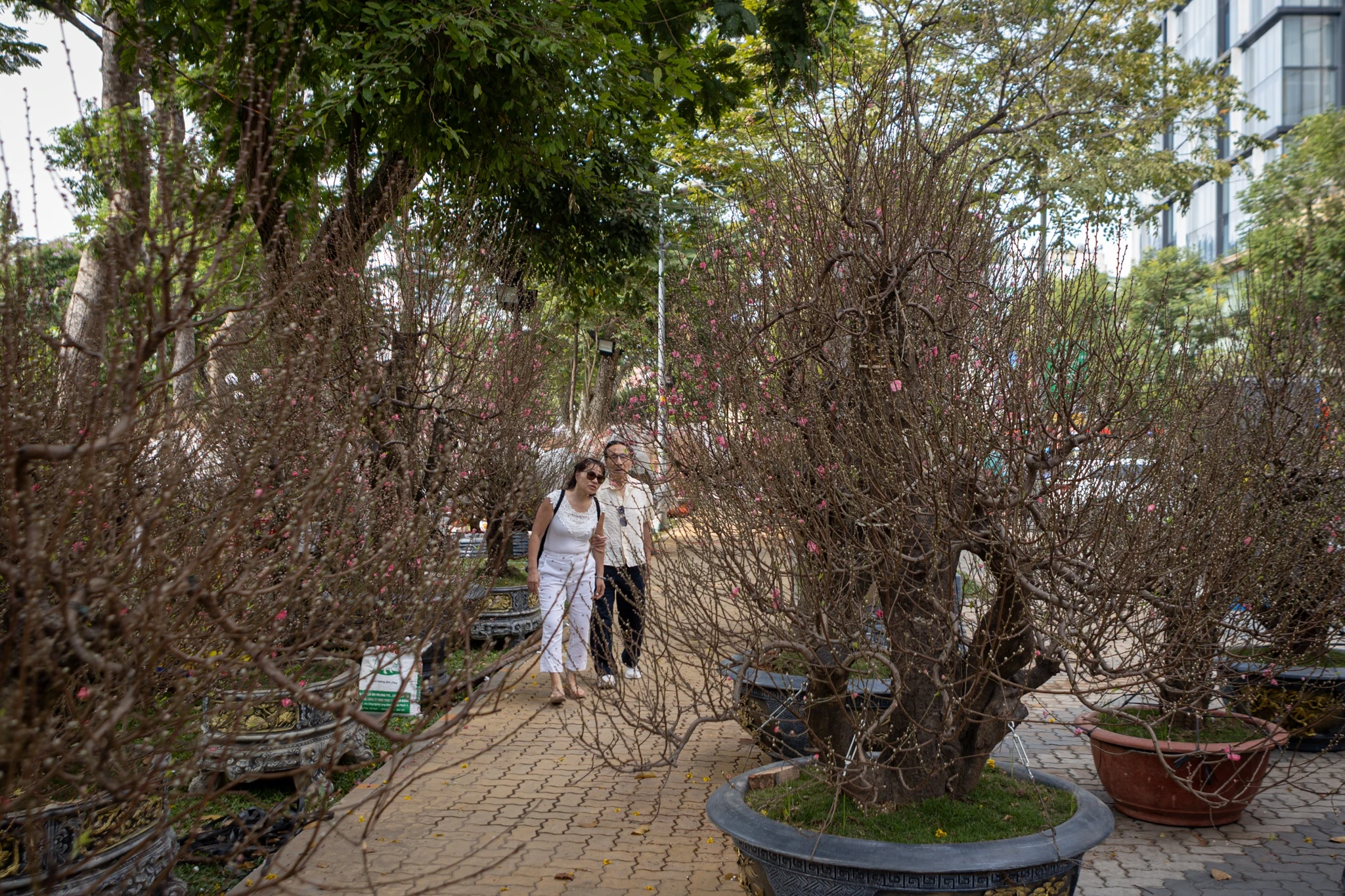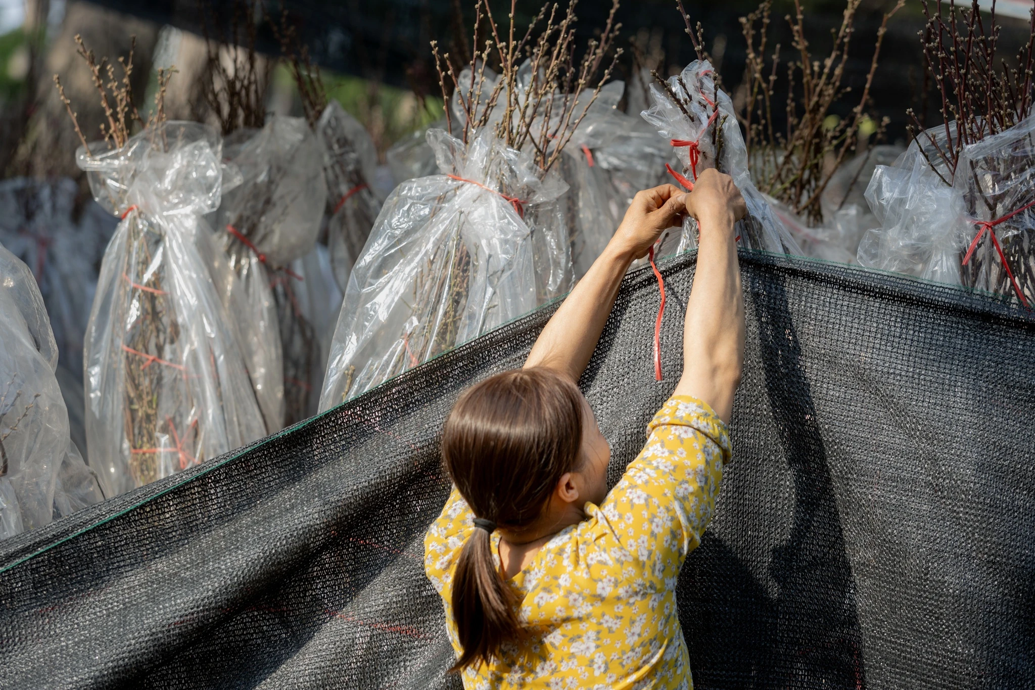 Tiểu thương này chia sẻ thêm số đào cổ thụ nói trên có nguồn gốc từ rừng Mộc Châu (Sơn La), được người dân địa phương trồng và chăm sóc trong nhiều năm. Sau đó, bà mua lại phần gốc, thuê vận chuyển từ miền Bắc vào TP.HCM. Khi đưa cây về, phần thân và tán được cắt gọn, chỉ giữ lại gốc lớn. Từ nền gốc này, bà tiếp tục chiết, uốn và tạo dáng cành, điều chỉnh độ dài, thế cành để tổng thể cây cân đối, hài hòa trước khi đưa ra trưng bày. Các tay cành được tạo khung nhằm đảm bảo hình dáng ổn định trong suốt thời gian bày bán.