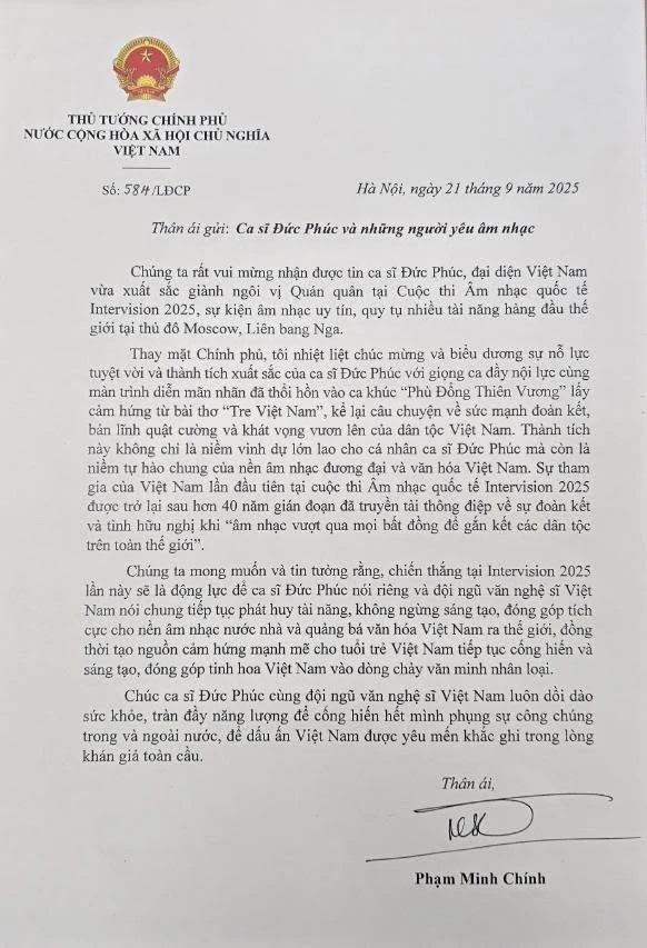 Trong thư gửi tới ca sĩ Đức Phúc, Thủ tướng nhấn mạnh rằng chiến thắng này không chỉ là vinh dự lớn cho cá nhân nghệ sĩ mà còn là niềm tự hào chung của nền âm nhạc đương đại và văn hóa Việt Nam. Theo Thủ tướng, việc Việt Nam tham gia cuộc thi Intervision sau hơn 40 năm gián đoạn mang ý nghĩa đặc biệt, góp phần lan tỏa thông điệp về tình đoàn kết và hữu nghị giữa các dân tộc, nơi "âm nhạc vượt qua mọi bất đồng để gắn kết các dân tộc trên toàn thế giới".