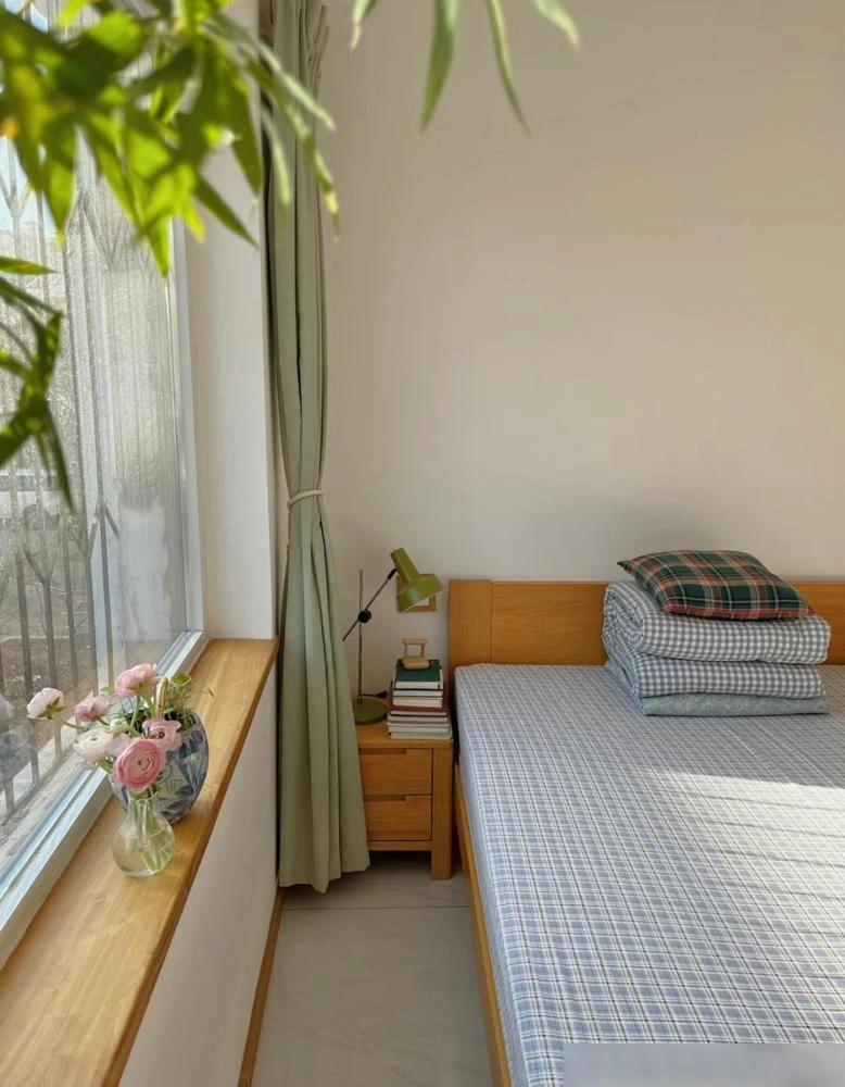 Bên trái giường là góc xanh nho nhỏ – một nhành cây, vài chiếc lá, đủ để mang thiên nhiên vào không gian hẹp.