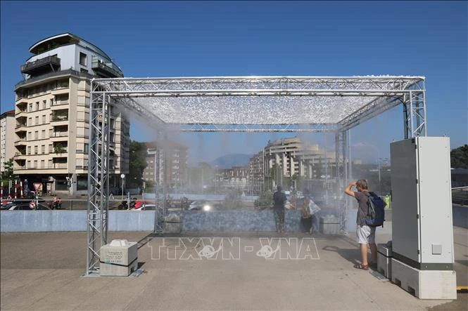 Hệ thống phun sương được lắp ở khu vực phường Grand Saconnex của Thành phố Geneva, Thụy Sĩ. Ảnh: Anh Hiển/PV TTXVN tại Thụy Sĩ