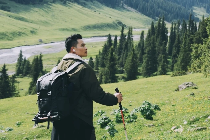 Vinh Nguyễn trên cung đường trekking hồ Eshenkul. Ảnh: NVCC