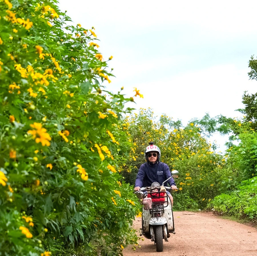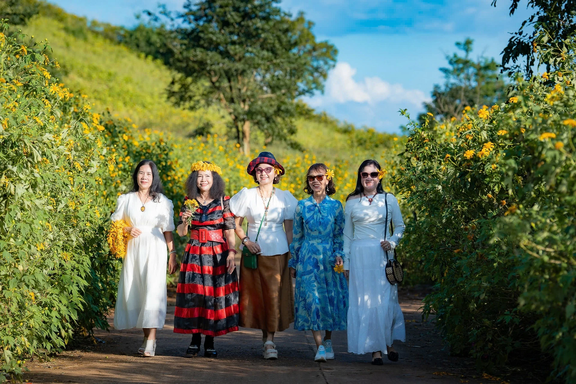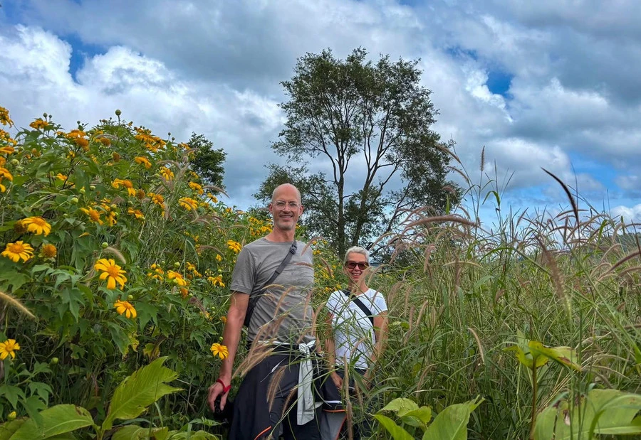 Du khách quốc tế thích thú hòa mình vào mùa hoa dã quỳ. Ảnh: Hoàng Ngọc