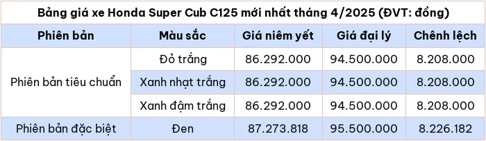 Mức giá niêm yết của xe Honda Super Cub C125 trong tháng 4/2025 vẫn được hãng duy trì ở mức cũ của tháng trước, cụ thể như sau: Phiên bản tiêu chuẩn vẫn đang duy trì với mức giá bán 86.292.000 đồng và phiên bản đặc biệt vẫn đang duy trì với mức giá bán 87.273.818 đồng.