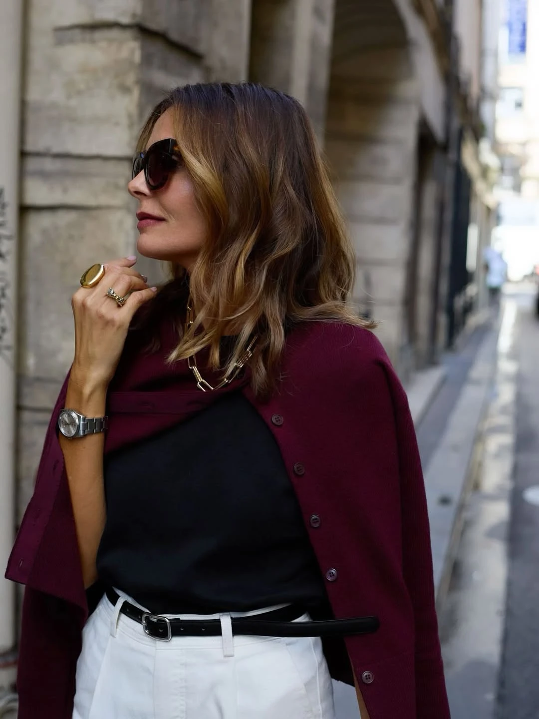 Một cách mặc khác của áo len khi quý cô muốn thu hút sự chú ý vào sự nổi bật của màu sắc kết hợp hài hòa với phụ kiện, cách stylist tóc và trang phục – áo khoác hờ trên vai và chỉ cài một cúc, dùng phụ kiện vòng cổ dạng chuỗi xích để làm điểm nhấn