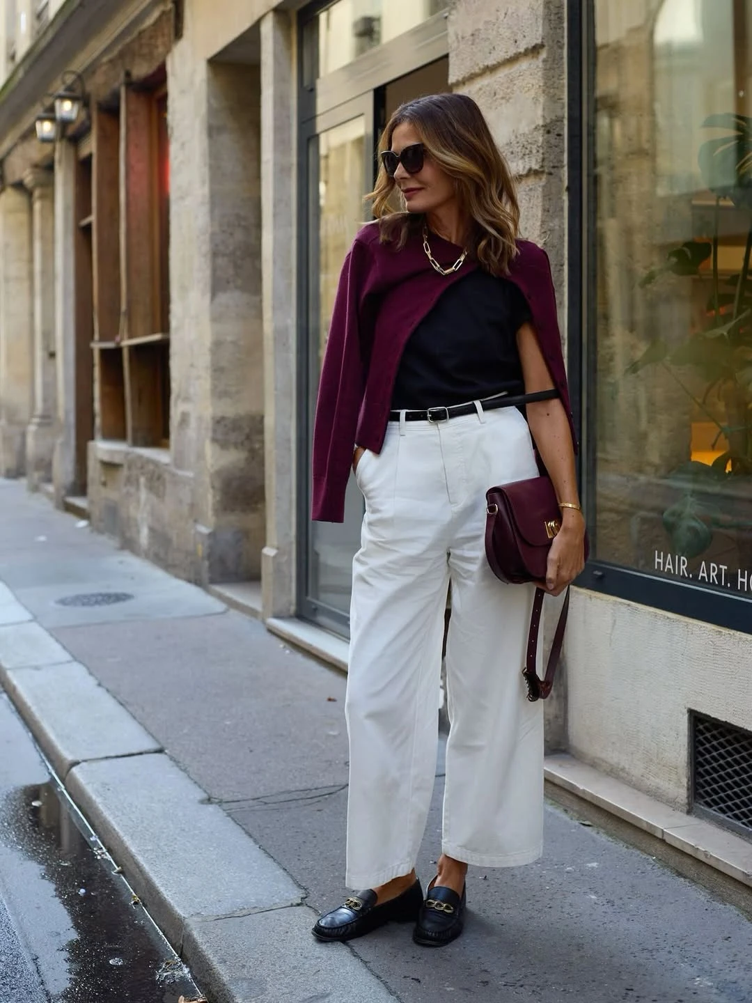 Áo len dệt kim tay dài, cổ thuyền trễ vai khơi gợi cảm xúc lãng mạn và sự quyến rũ. Phối cùng quần âu kẻ sọc cổ điển, giày bốt cổ thấp và túi đeo vai tối giản