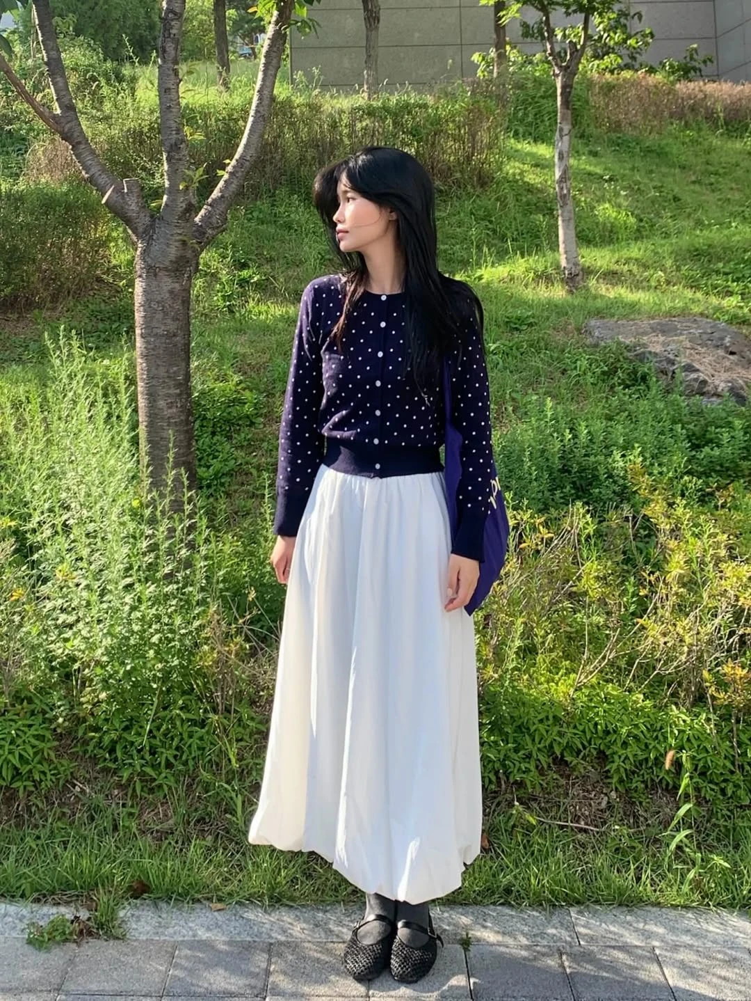 Một chiếc cardigan màu xanh đen điểm chấm bi tròn có độ ôm nhẹ mặc cùng chân váy trắng tạo nên diện mạo dễ thương và xinh xắn . ẢNH: DANBI