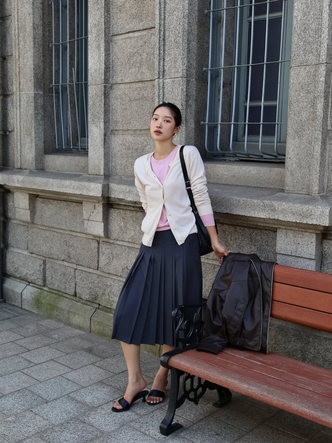 Kiểu dáng tối giản của cardigan được làm mới theo cách sắc sảo, ấn tượng qua các chi tiết tinh tế. Áo len màu xám họa tiết ô quả trám lồng ghép hình trái tim, chi tiết tay ngắn phá cách kết hợp cùng chân váy xếp ly, loafer và tất cổ cao
